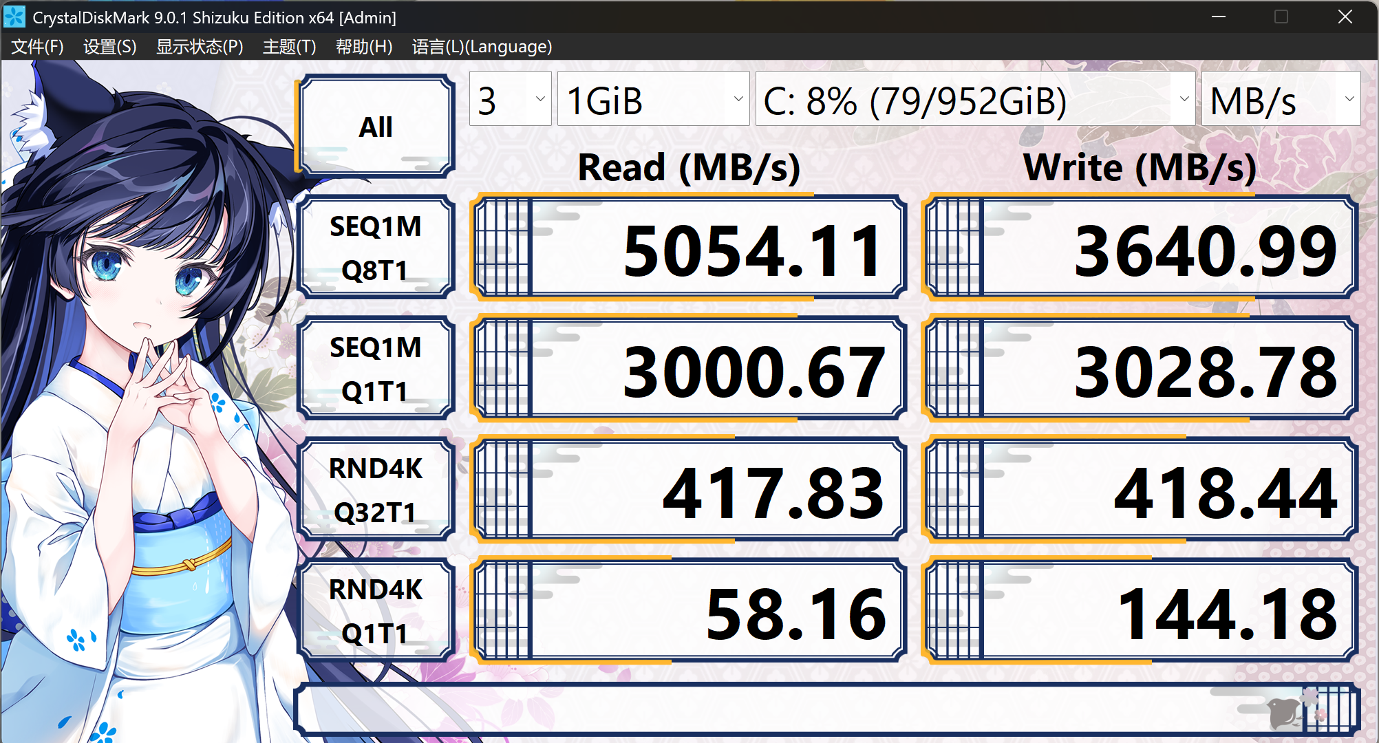 1TB的固态硬盘速度也很给力,读取速度得到5054.11MB/s,写入速度达到3640.99MB/s