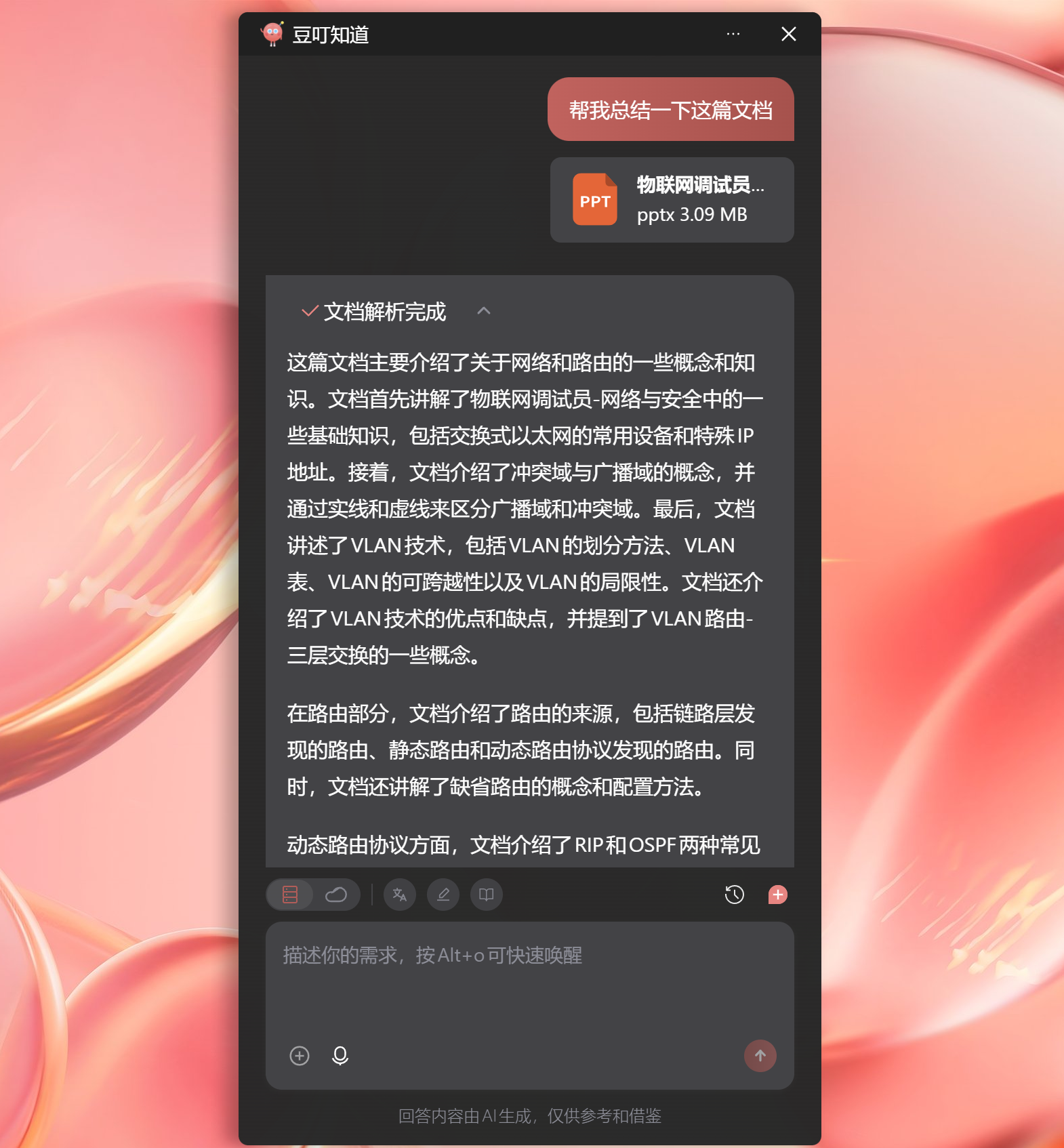 不清楚的事情问豆叮,它可啥都知道,地理历史、科学百科、网络热梗没有它不知道的。日常工作你也可以让豆叮帮你完成,当你还在发愁年终总结怎么写的时候,豆叮已经把一份条理清晰、详略得当的总结报告展现在了你眼前。
