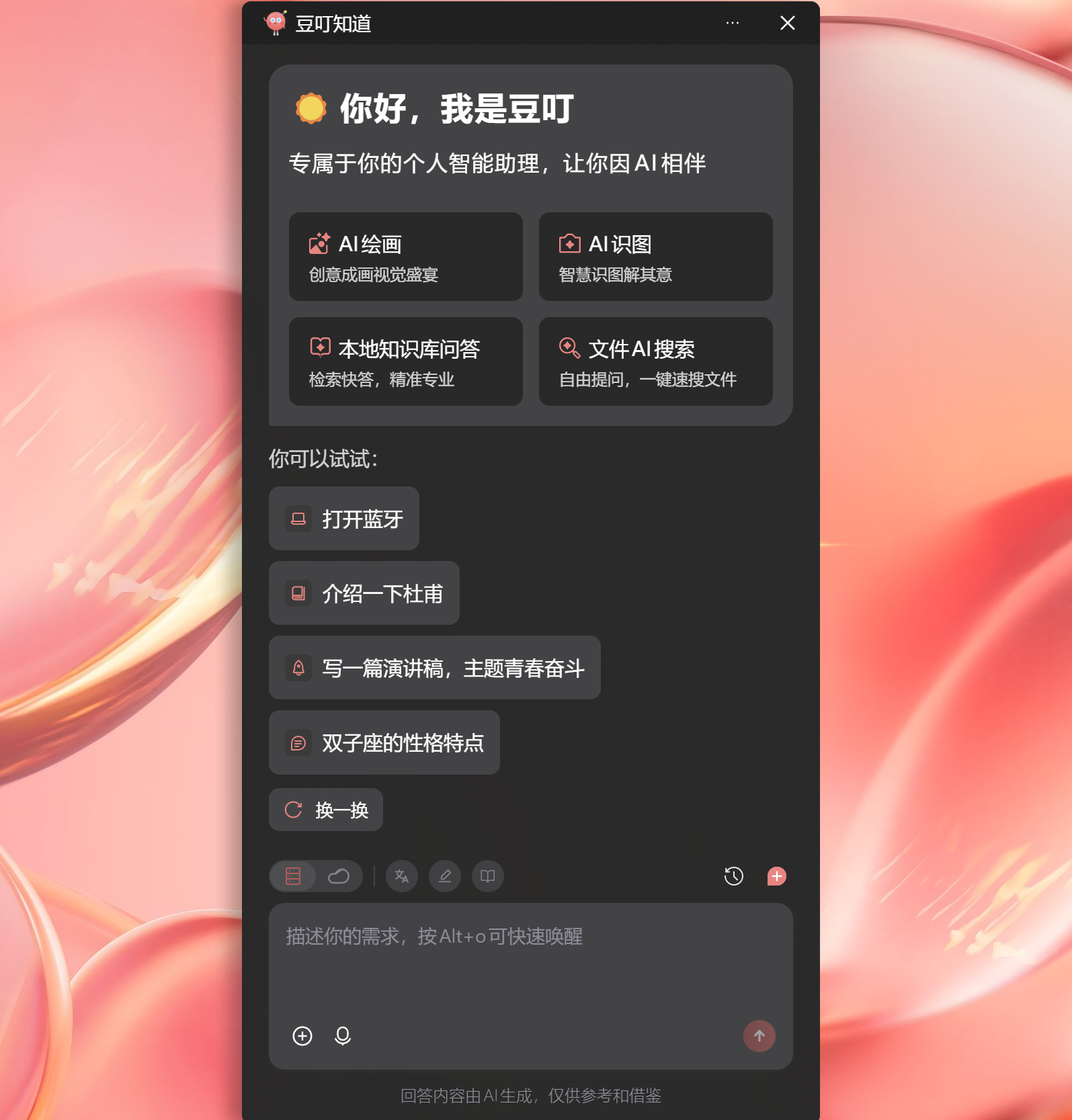 豆叮AI助手+豆叮知道这样的双AI组合真的能让你享受的拥有一个时刻线的AI助手方便。