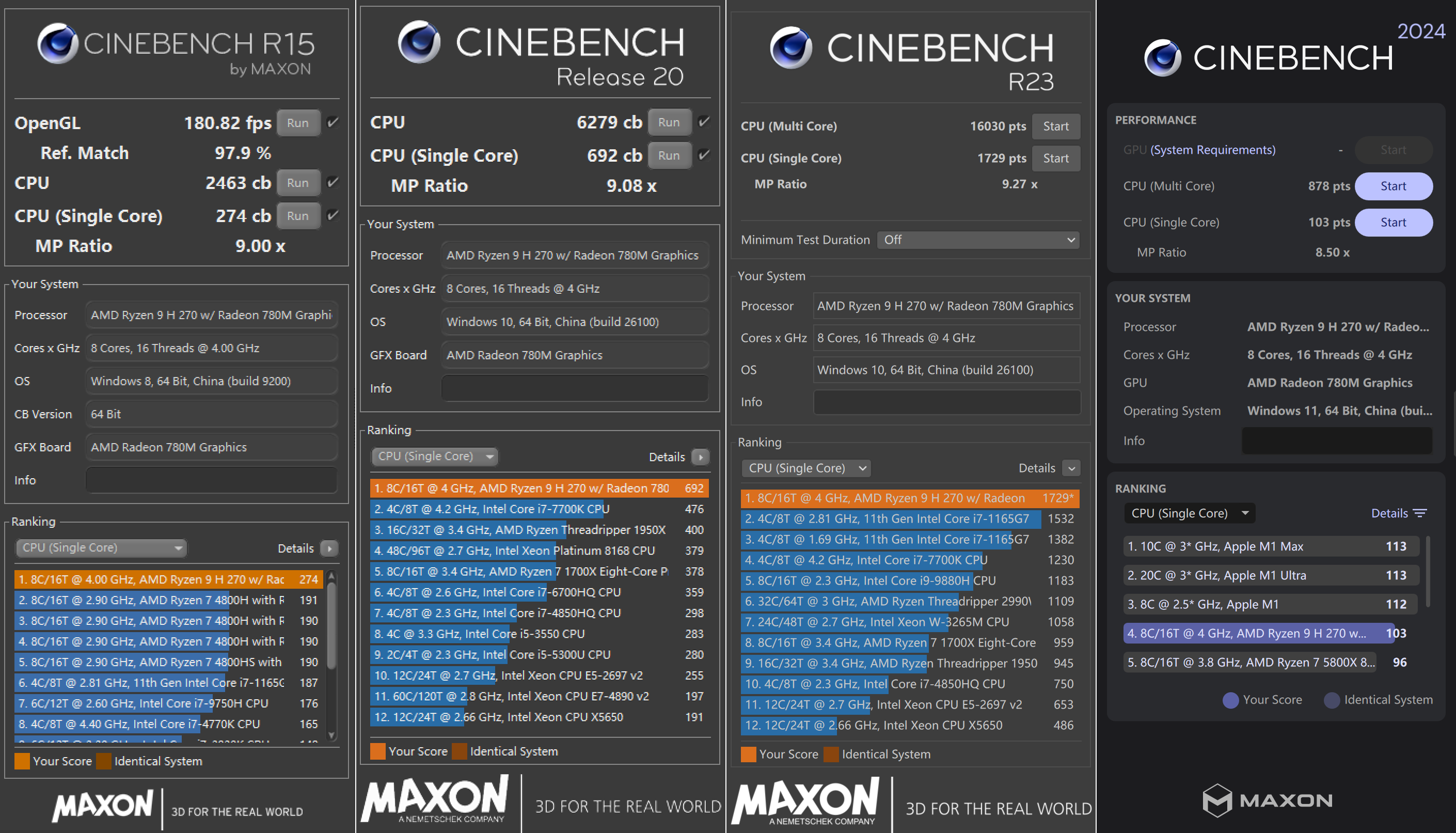 CINEBENCH R15单核274cb,多核2463cb;CINEBENCH R20 单核692cb,多核 6279cb;CINEBENCH R23单核1729pts,多核16030pts;CINEBENCH 2024 单核103pts,多核878pts。
