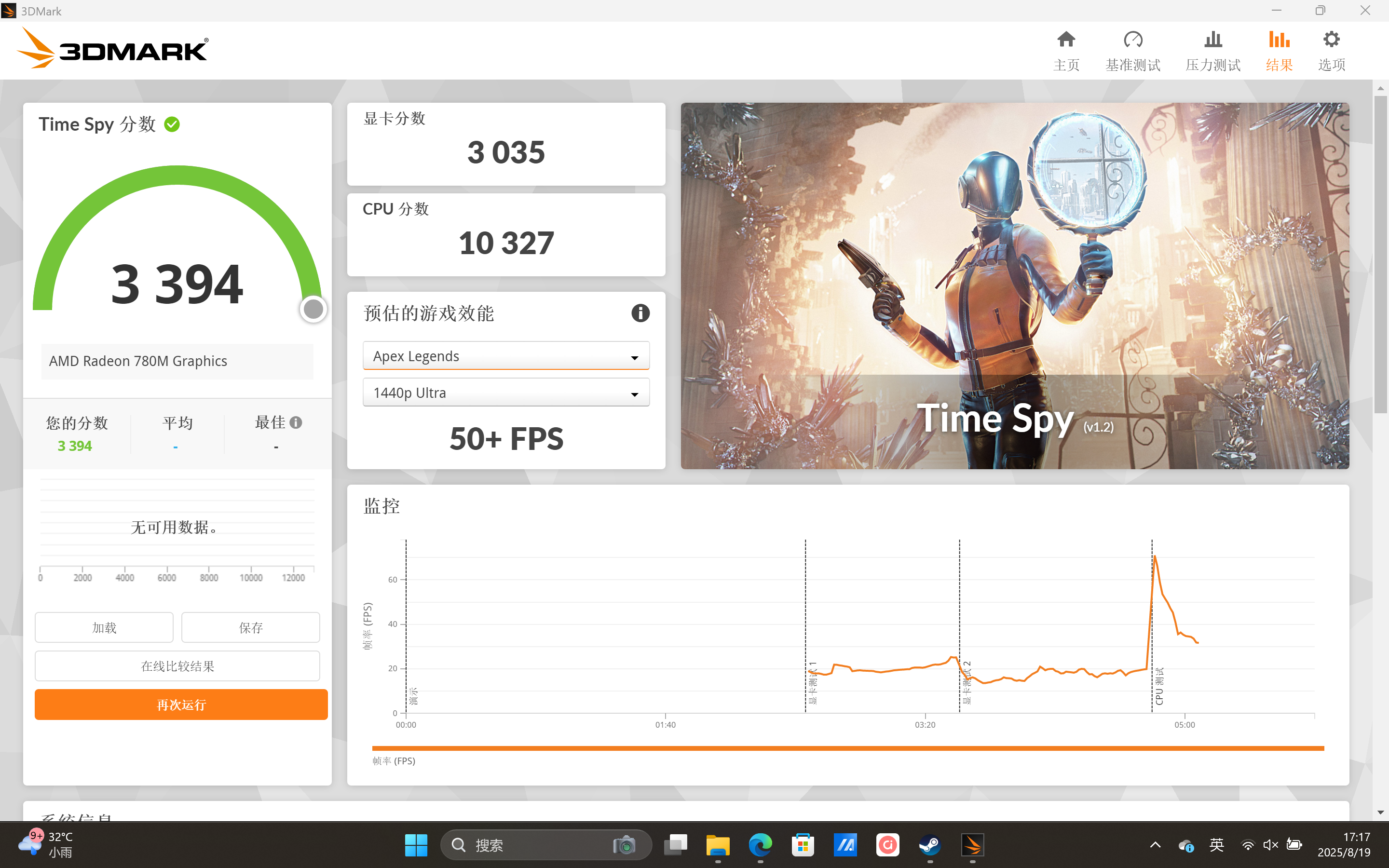 锐龙9 H 270处理器上还集成了Radeon 780M显卡,基于RDNA 3架构,拥有12CU图形核心数,核心规格包括768个流处理器、12个光追单元,加速频率达2800MHz,有着接近与GTX 1650的性能表现,但却仅有15W的功耗远低于同级别独显50W左右功耗。3D Mark实测 Time Spy分数3394,显卡分数3035,CPU分数10327,预估Apex 英雄1440P分辨率可以达到50+FPS表现,可以说用华硕a豆14 Air 香氛版是可以玩主流3A大作以及热门网游的,在1080P分辨率下能够获得流畅体验。