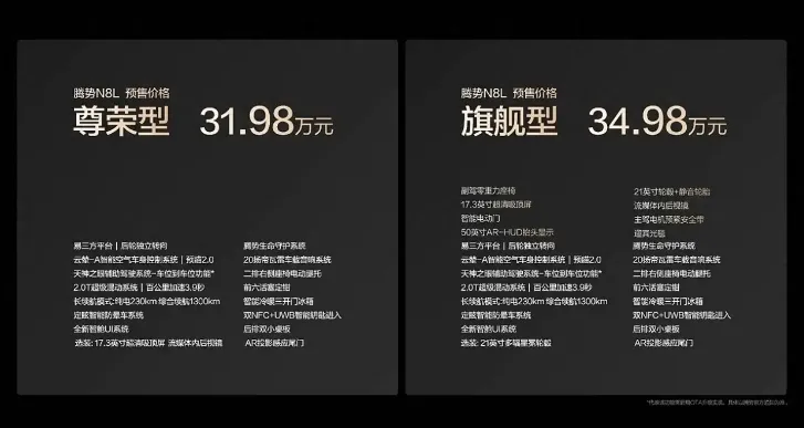 那么腾势N8L和它大哥腾势N9该怎么选呢?两台车配置几乎一样,N9的起售价是38.98万,N8L预售价31.98万,正式上市大概率30.98万起,差价8万就是尺寸小一点,这么一算腾势N8L的性价比是不是就出来了?要是你在这两辆车中间犹豫,我极力建议选N8L,8万块钱节省下来能办好多事儿呢。