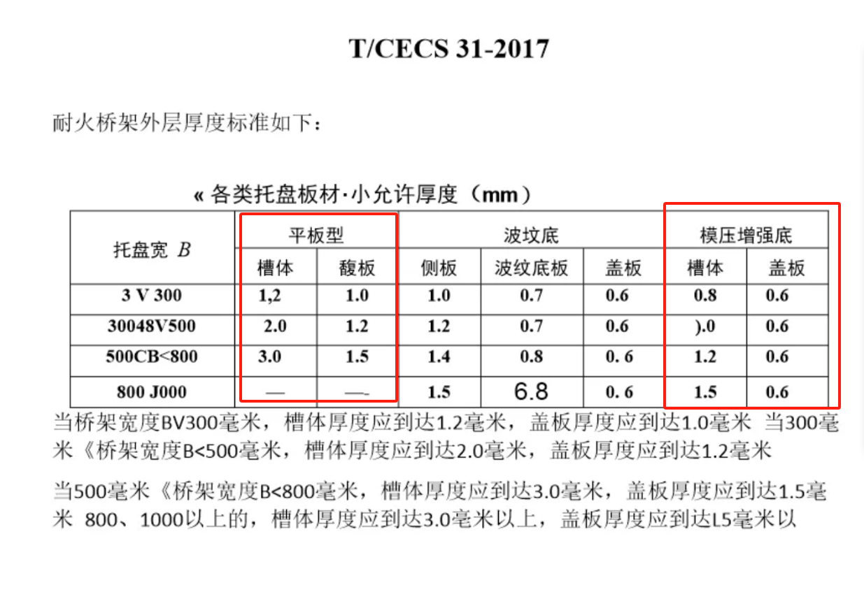 桥架宽度 300mm~600mm:底板最小厚度≥1.0mm,侧板最小厚度≥1.2mm;