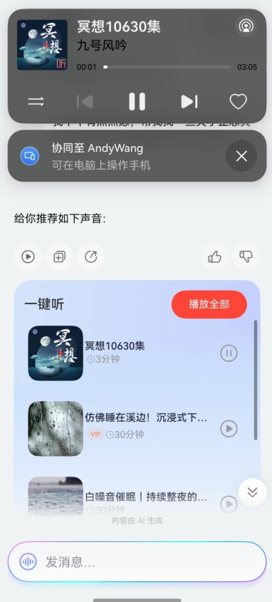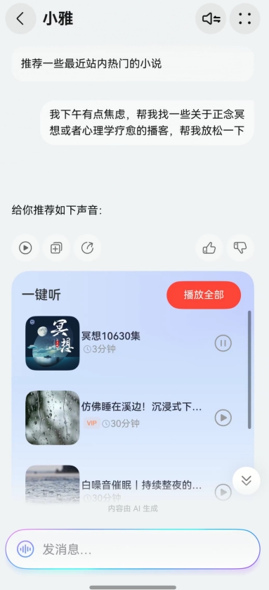 每当下午感到焦虑烦躁,我就会戴上耳机,对小雅Agent说:“下午有点焦虑,帮我找些关于正念冥想或心理学疗愈类的播客放松一下。”小雅Agent会迅速响应,并推荐冥想音乐、疗愈白噪音、催眠放松音乐播客等治愈类内容。点击“播放全部”后,小雅Agent将立即调用喜马拉雅开始播放。十几分钟的“精神SPA”做完,感觉紧绷的神经慢慢放松,又能元气满满地投入工作。总的体验下来就是:用小艺,事事都容易!