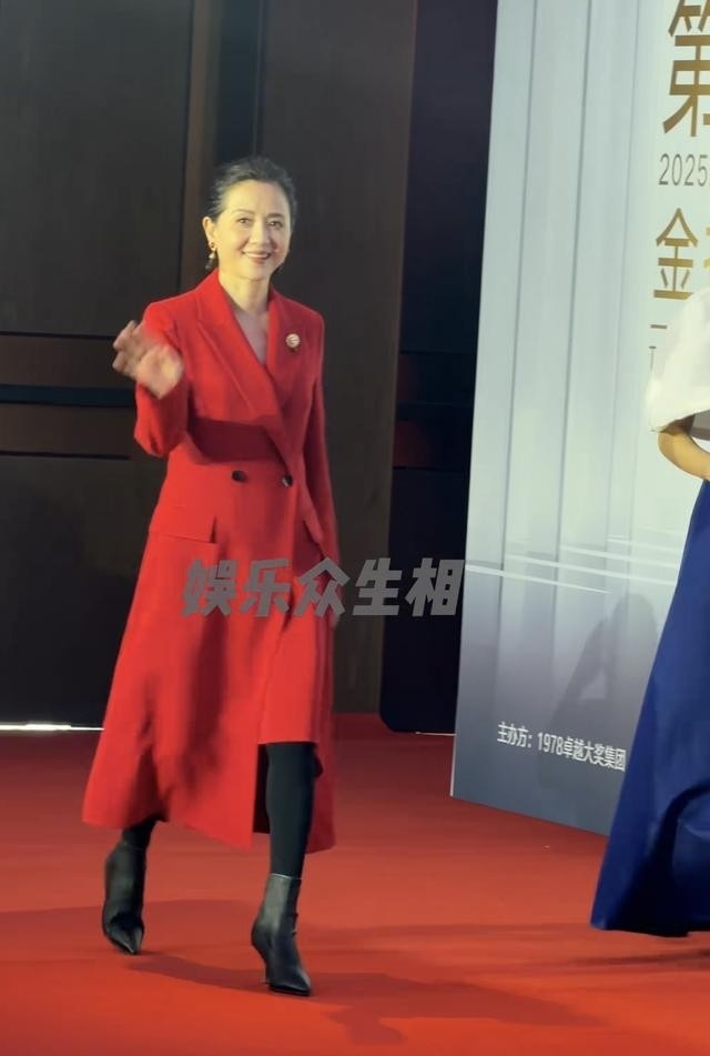与此同时,陶慧敏以红色大衣为主的装扮登场,她将头发盘起,脚踩高跟鞋,没有添加过多配饰。她的走红毯过程显得从容,她稳步前行,没有过多停顿摆拍,而是自然地与周围互动。陶慧敏的这一选择让她的整体形象显得简约却不失庄重,在灯光下红色大衣的色调与活动氛围相协调。活动进行中,她参与了颁奖环节,站在台上时保持了微笑,与其他演员交流时表现出尊重。