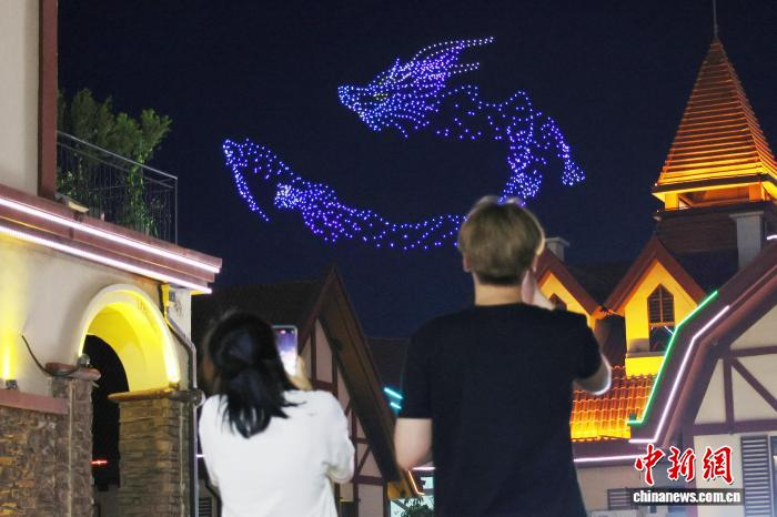 8月8日,游客在金沙滩啤酒城内观看无人机表演。张孝鹏 摄