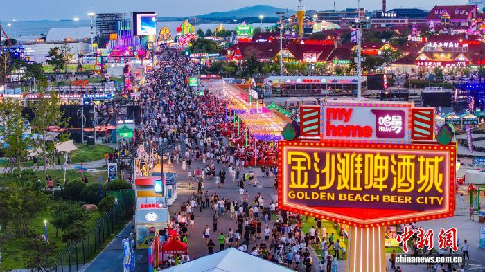 7月19日,金沙滩啤酒城内游人如织。(无人机照片)青岛西海岸新区工委宣传部供图