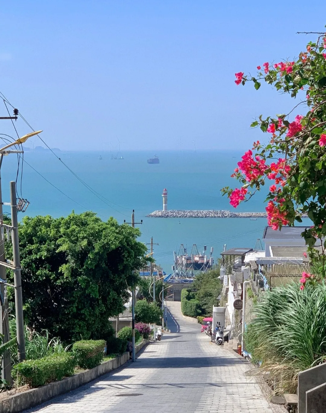 桂山岛的美景无处不在,爱民路是一条通往大海的下坡路,站在这里,可以远眺海平面和灯塔,感受大海的壮阔。