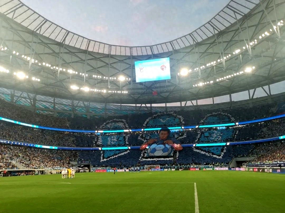 北看台的巨幅TIFO,把阎相闯缝补足球的画面做成海报。