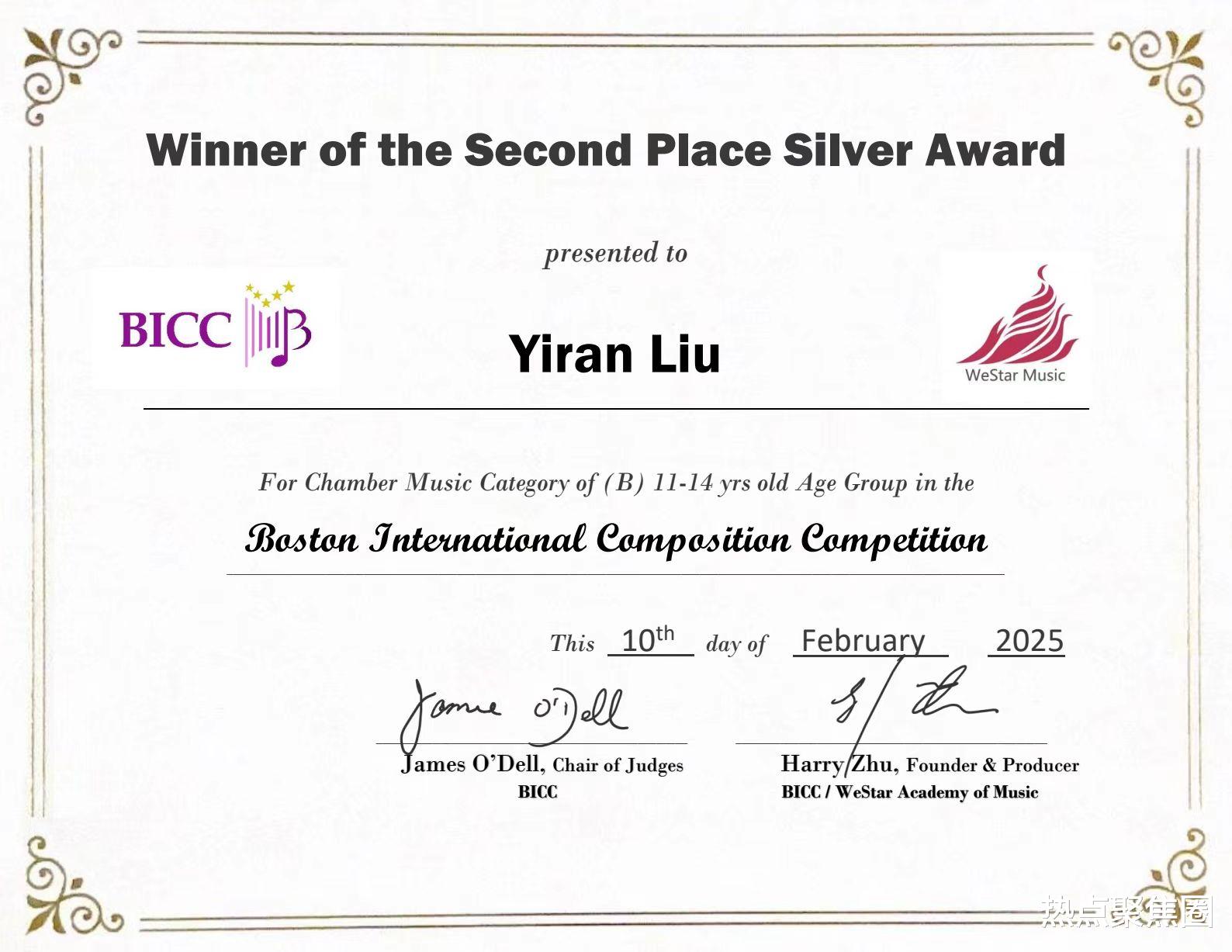 2025年2月10日,波士顿讯 ——少年作曲家刘怡然(Liu Yiran)于今日在2025年波士顿国际作曲大赛(Boston International Composition Competition)中脱颖而出,以原创作品《困在时间里的蝴蝶》荣获B组(11-14)岁年龄组银奖,是这个组别奖项中唯一的中国选手。这一荣誉不仅标志着她在国际音乐舞台上的又一次突破,更彰显了新生代华人创作者在全球艺术领域的卓越影响力。