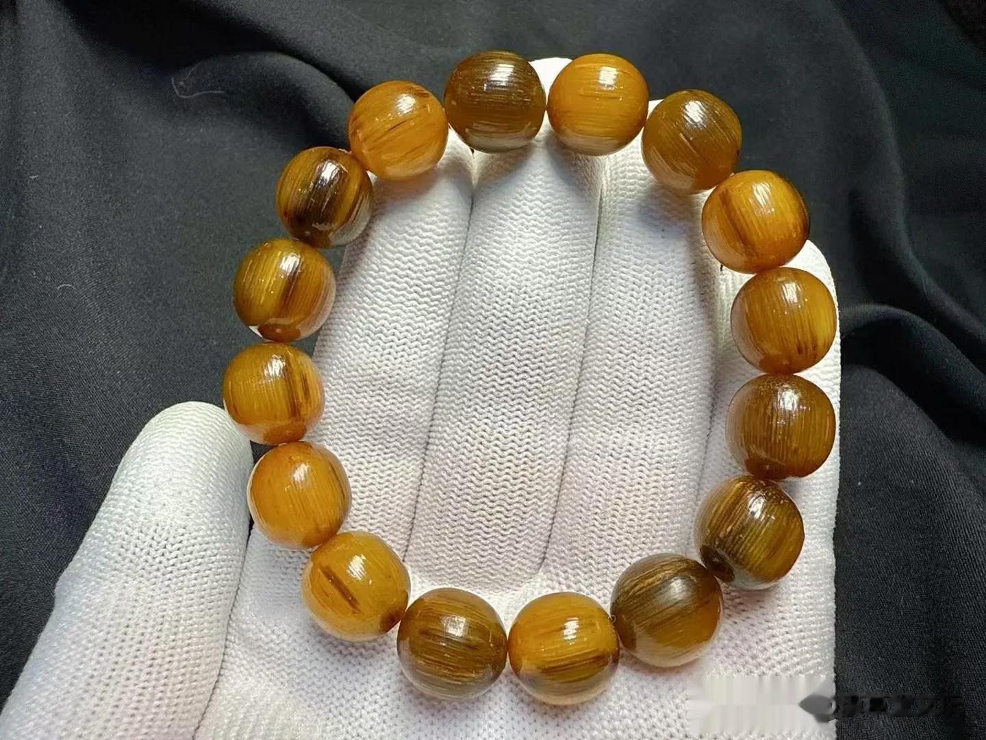 而在手串珠子的纵切面上,咱们能看到一些竹丝纹理。这些细细的,像头发丝一样的深色线条非常顺直,不交叉,都是平行到底。有点像劈开的竹丝或者木桩。而且需要注意的是这些纹理不是浮在角表面或者凹进去,触感上是平整的,有些树脂仿造会有沟壑感,其实是不对的。