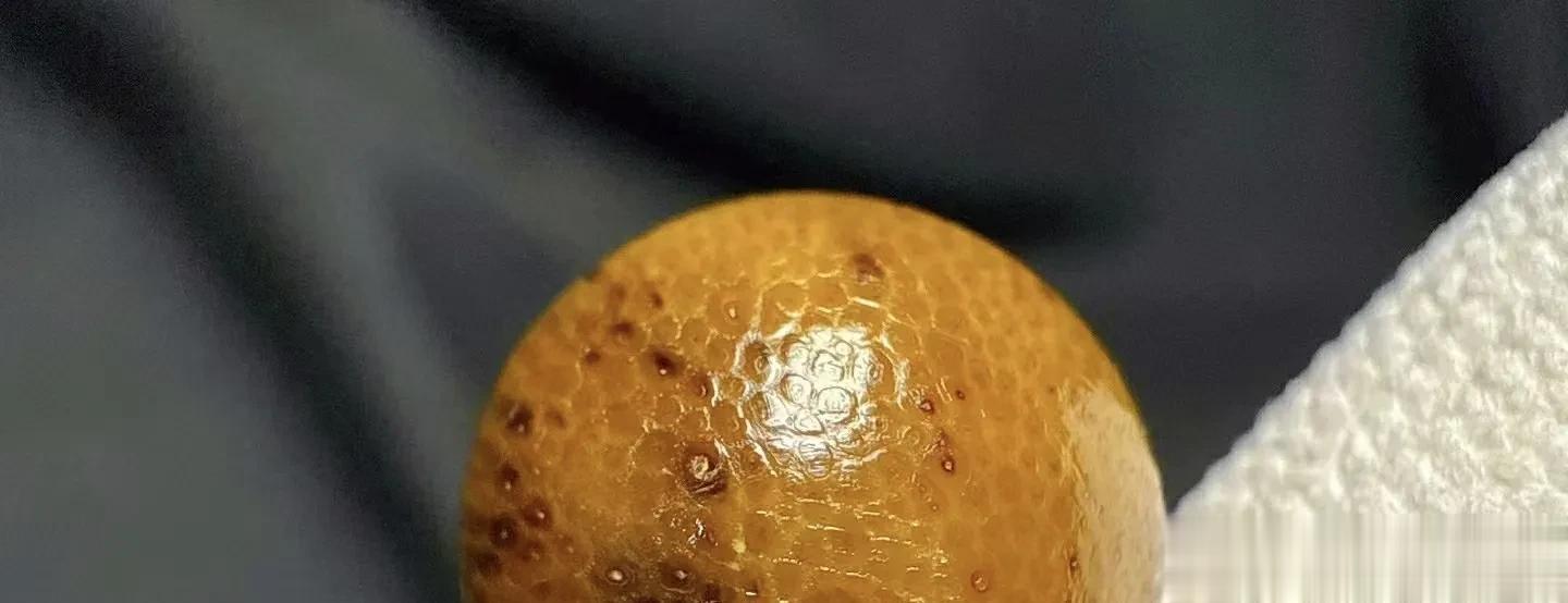 犀角手串要看真假,还得借用放大镜,有些品种纹理太细小了,肉眼很难区分。你可以看一下,通过放大镜咱们能看到一大堆小小的深色点,他们紧紧挨着聚集在一起,圈点之间几乎没有间隙,就像青蛙卵一样的一个个大小不一。这些小点就是鉴定师傅常说的鱼子纹理。一般在犀角的横切面能看到,珠子的话在孔道附近。