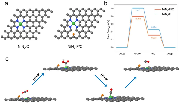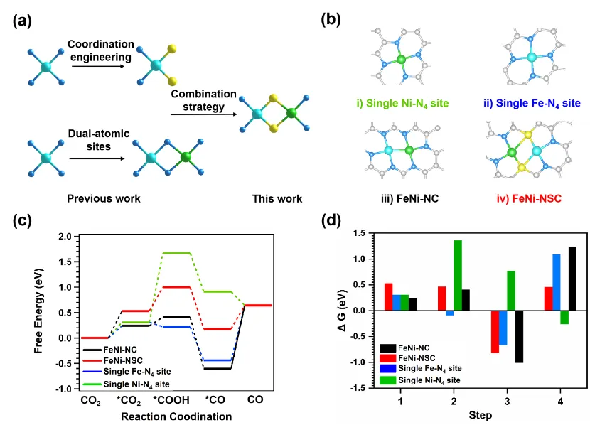 在二氧化碳还原反应(CO₂RR)中,反应路径更加复杂,涉及多步氢化及质子-电子转移过程。自由能台阶图可用于解析不同产物形成途径的竞争过程。例如,针对Fe-N4-C单原子催化剂的研究显示,在-0.45V(vs.RHE)时,CO的自由能约为-0.47eV,而CO进一步氢化生成*CHO的ΔG高达1.12eV。因此,该催化剂主要将CO₂还原为CO,CO的法拉第效率高达95%。此外,通过考虑溶剂化修正,可以将计算的CO2吸附能与实验数据更好地对应,为催化剂设计提供可靠依据。此类案例表明,自由能台阶图能够定量揭示不同路径中间体的稳定性差异,从而预测反应选择性和产物分布。