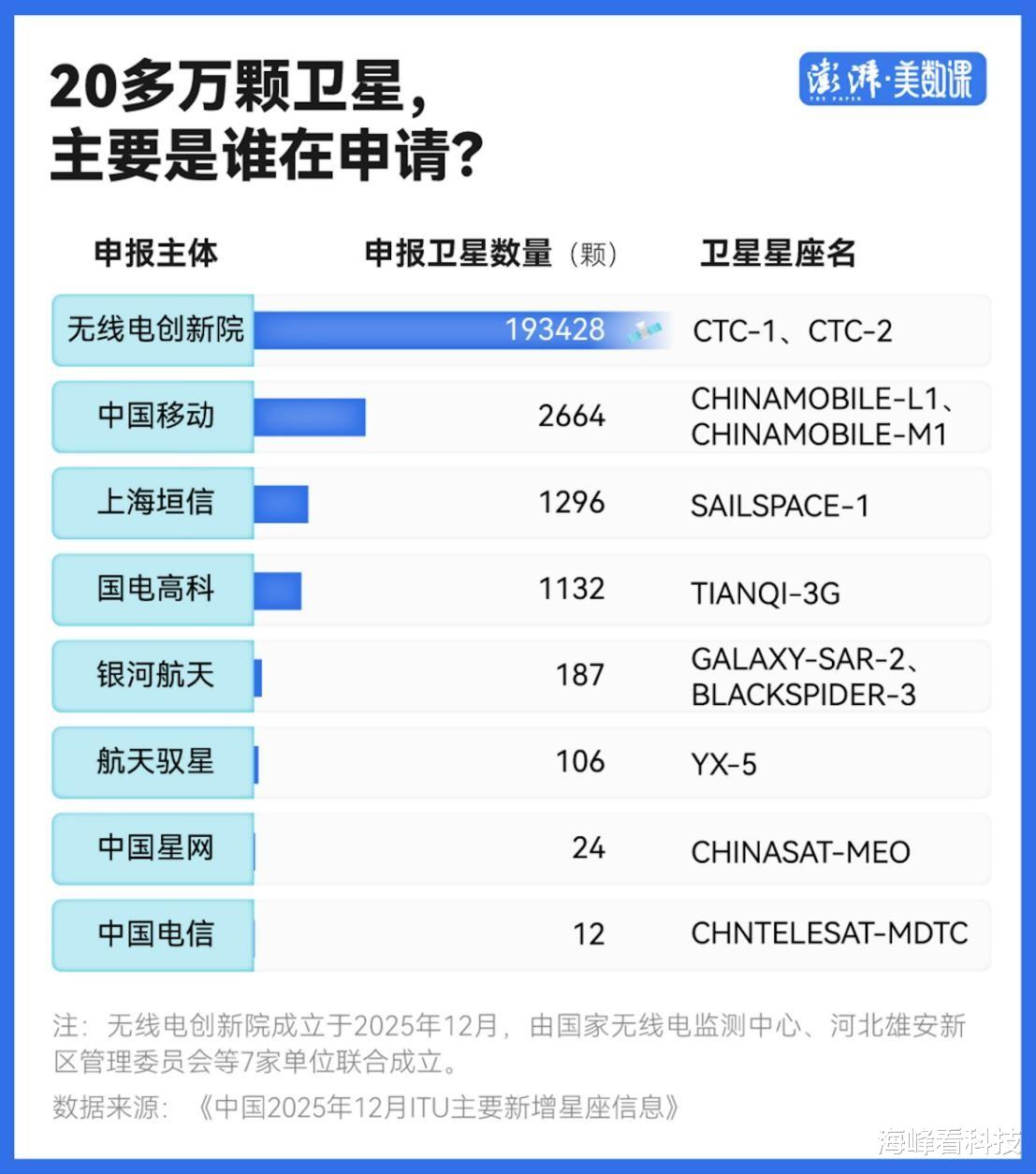 首先,牵头主力是无线电频谱开发利用和技术创新研究院(简称无线电创新院),这家2025年12月刚在雄安注册的新型研发机构,一口气申报了CTC-1和CTC-2两个巨型星座,各96714颗卫星,合计193428颗,占总申报量的95%以上。