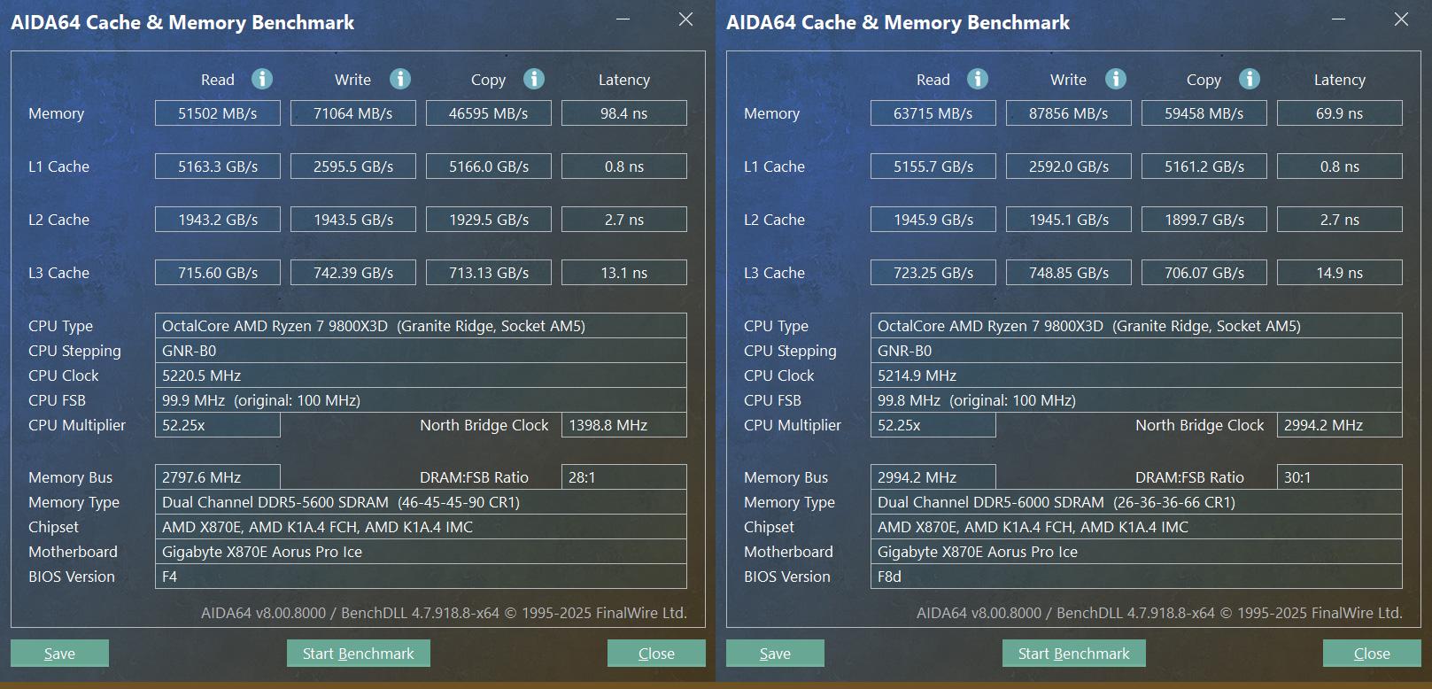 本次性能测试的平台是AMD 9800X3D+技嘉X870E AORUS PRO ICE。X870主板作为AMD新一代高端芯片组,优化了内存布线,提供更强的信号完整性以及对高频低时序内存更好的支持,确保用户能够真正获得金百达星刃RGB 6000 C26这种高性能内存所带来的好处。