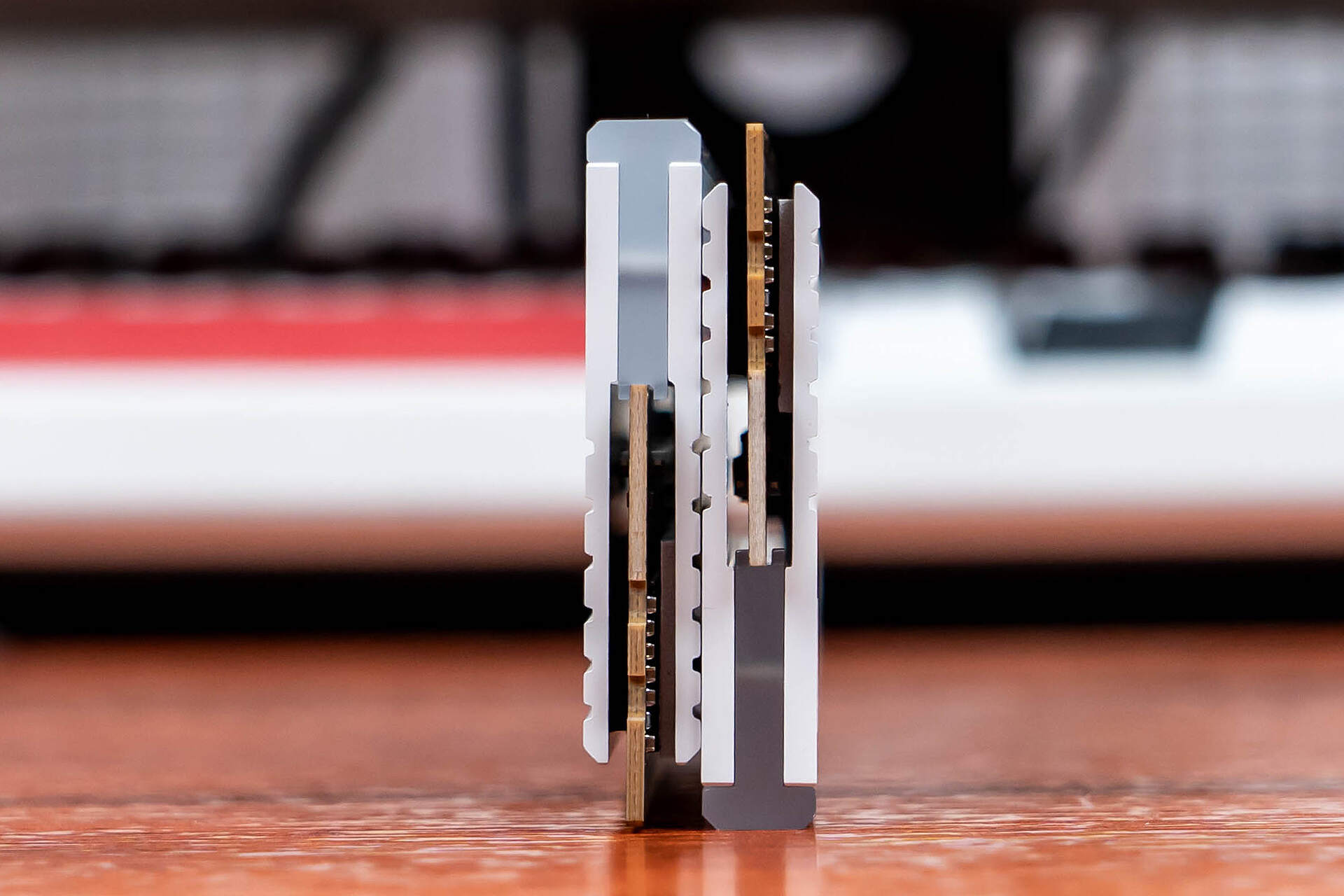 金百达星刃的金属金散热马甲不仅颜值高,还具有良好的导热性能。从侧面看,PCB板的颗粒面贴有5w工业级导热硅脂,能有效地将内存颗粒以及PMIC电源芯片产生的热量散发出去,与金属马甲配合,保证内存在长时间负载运行时也能保持稳定,避免过热降频。