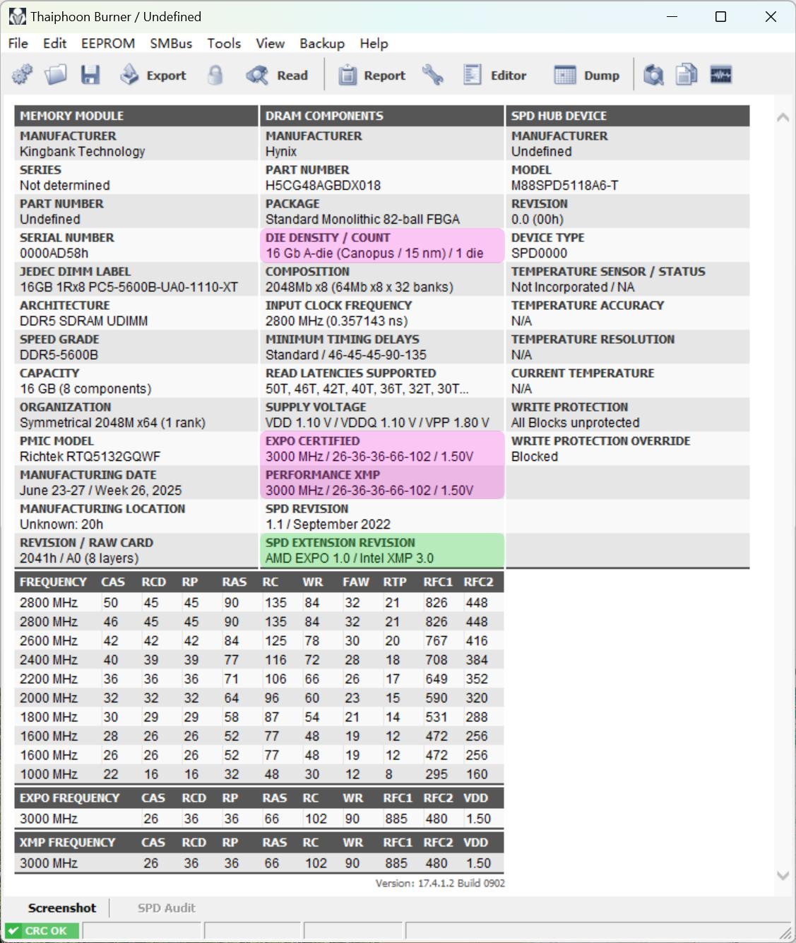 这套金百达星刃6000 C26低时序内存使用原装原印海力士A-die特挑颗粒,默认频率5600MHz,支持Intel XMP 3.0和AMD EXPO一键超频技术,可一键超频至6000MHz,无需用户手动调整复杂的参数,0基础也能完成。