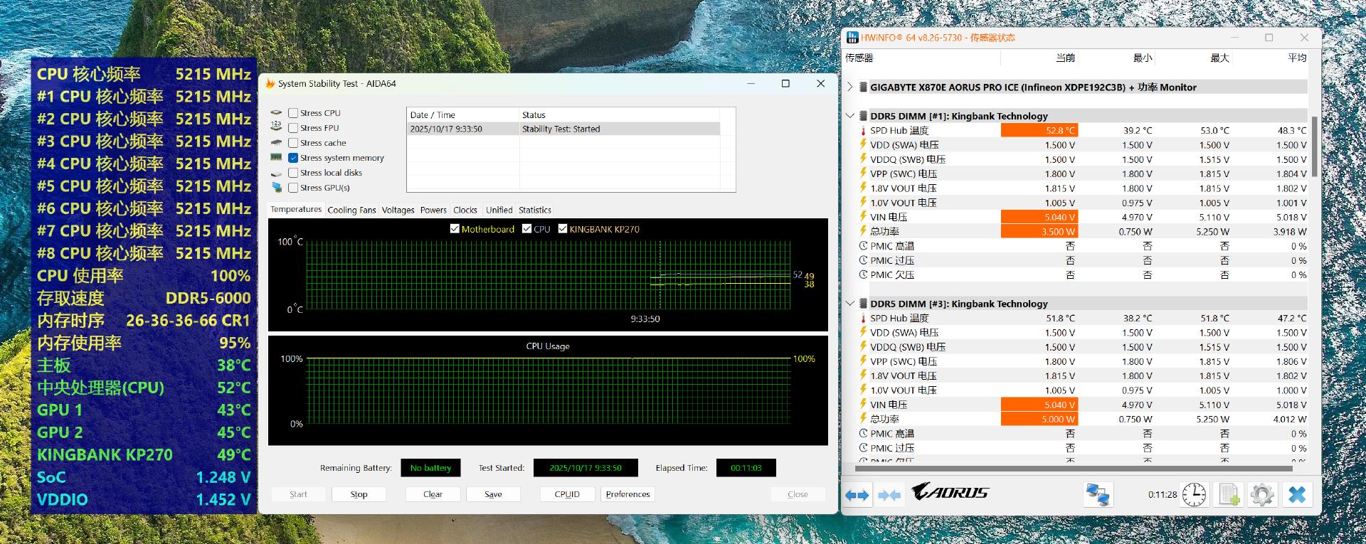 实测,在6000MHz频率满载压力测试10分钟左右,金百达星刃最高温度只有53℃左右,这说明它的散热效果非常出色。