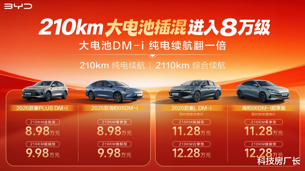 也不知道是谁把比亚迪逼急了,开年突然给混动车装了个“超大充电宝”,4款插混轿车和1款插混SUV的纯电续航加到210km,这是把一辆“剁椒鱼头”塞里面了啊。满油满电续航用车圈流行的话说,2100多公里不充一次电。