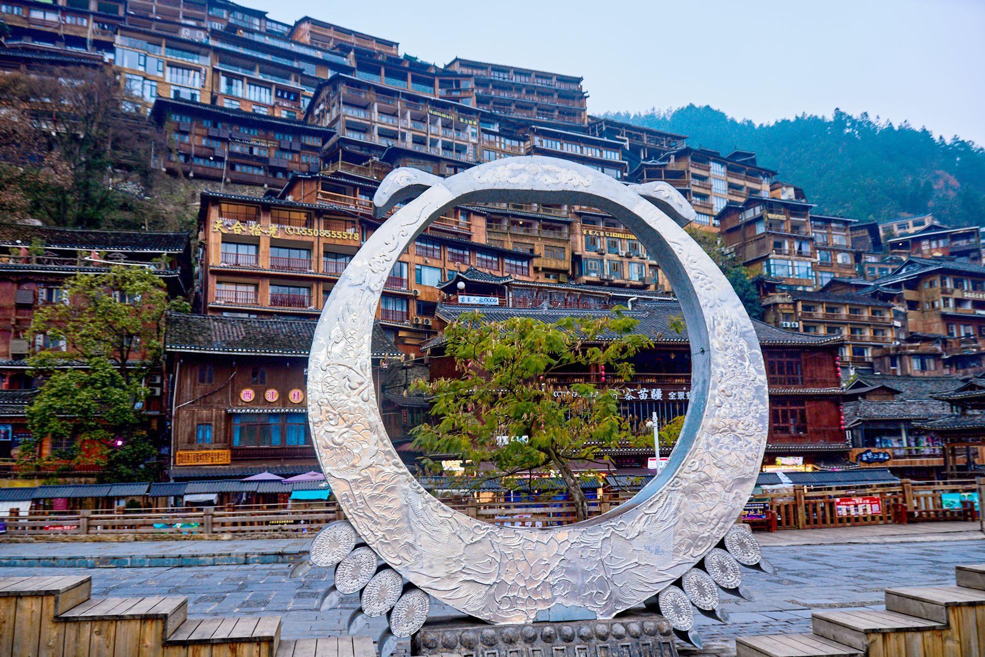 巨型苗寨银饰雕塑伫立在一片吊脚楼前,银白色环形项圈上刻着精致的苗族花纹,站在雕塑旁拍一张全景,是最有地标指向的打卡照。