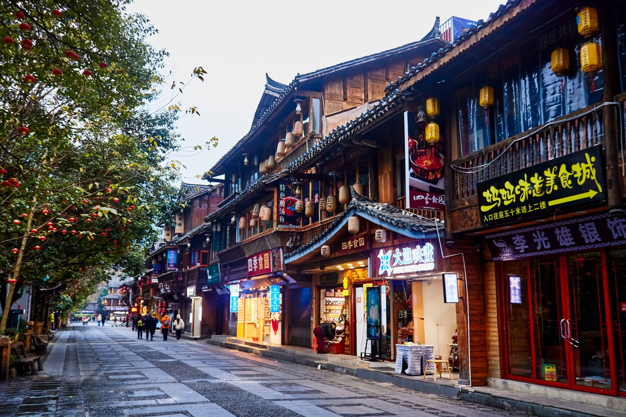 街巷中的石板路平坦整洁,古朴的建筑被青山绿水环绕,走在街上抬眼就能看到茂盛的山林,看到沿着山势铺陈而下的吊脚楼,它们和街道形成错落层次,身在商街,却有种已经融入到当地人生活的亲切感。