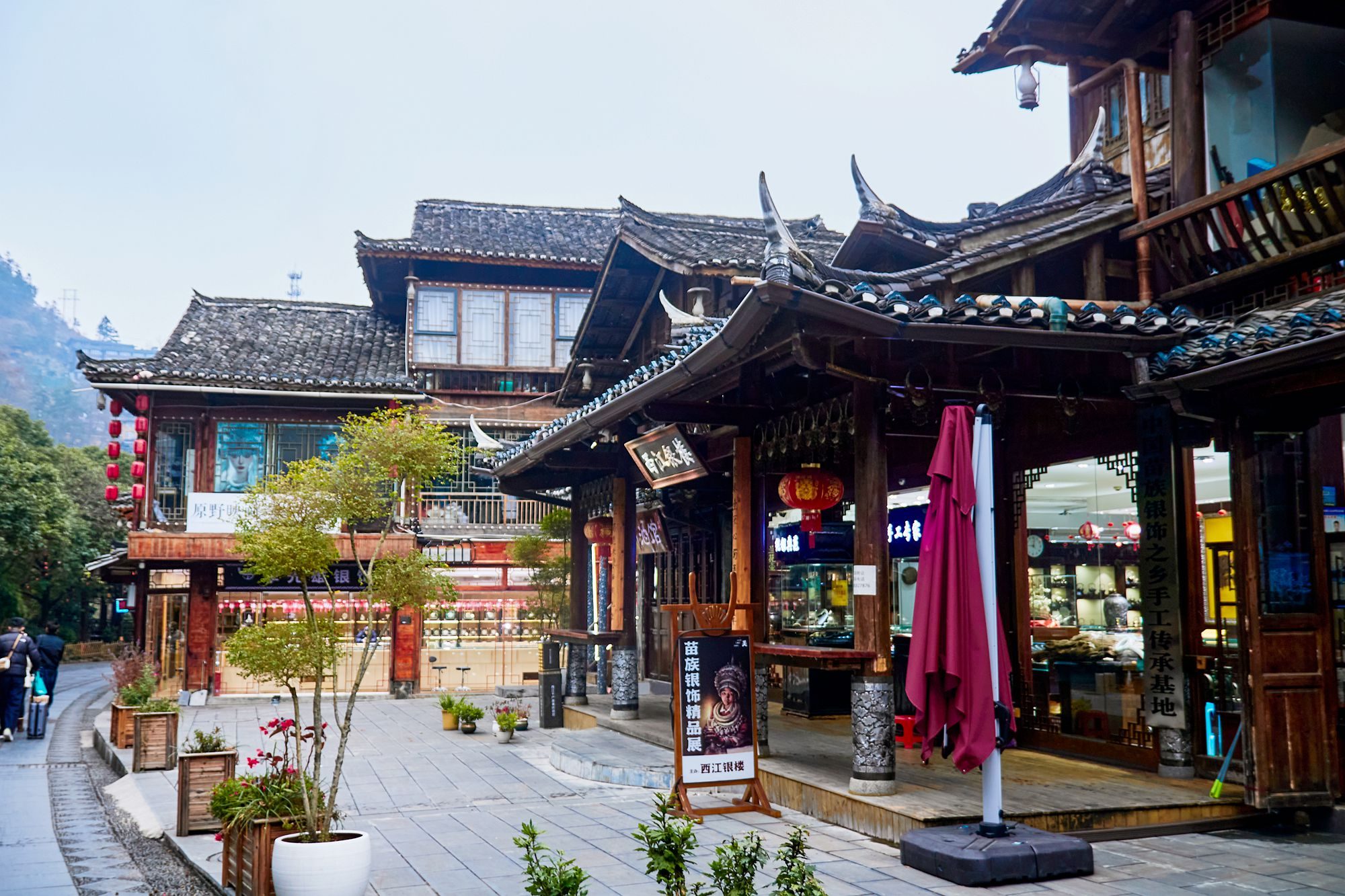 寨子里有条银饰非遗街,喜欢苗族银饰的小伙伴一定不要错过。街边的银饰店一家接着一家,飞檐翘角,外观古朴。橱窗里整齐摆放着各种造型的银项圈、银手镯,走进店中还能看到银匠现场打制银饰,特色十足。