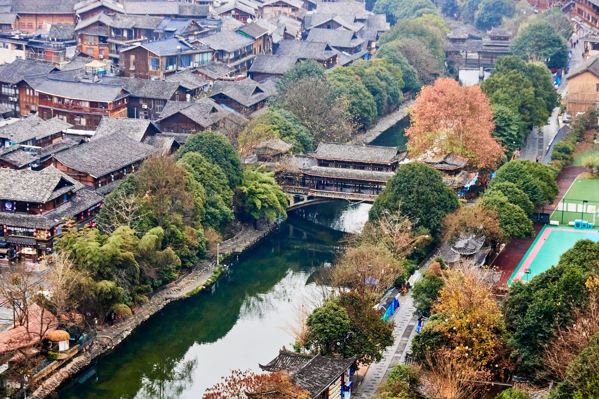 从高处俯瞰苗寨,整个寨子生长在山水中,被河水分成两半,吊脚楼密密麻麻铺满山坡,绿树点缀在褐瓦木屋间,薄雾将眼前画面渲染出几分柔和,美好得让人倍感治愈。