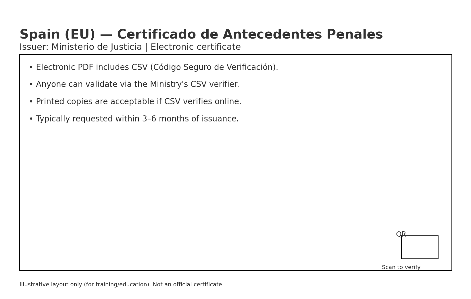 • 西班牙:Certificado de Antecedentes Penales(司法部),电子证书带 CSV/二维码,可在线核验;通常要求 3–6 个月内。