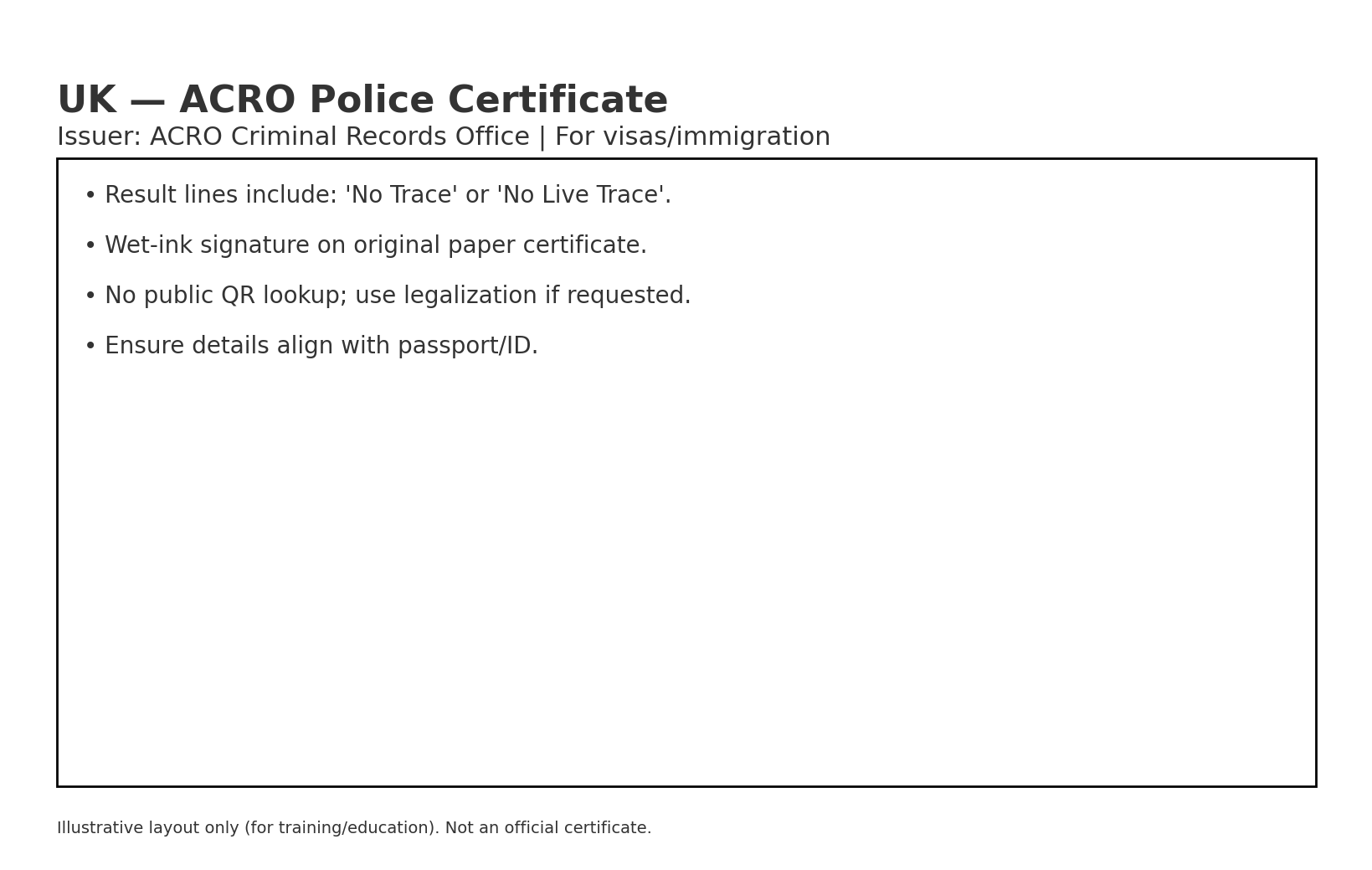 • 英国:用于签证/移民的官方文件为 ACRO Police Certificate(结果常见 “No Trace” 或 “No Live Trace”)。• 欧盟:各国各有全国性无犯罪证明(法国 Bulletin n°3、德国 Führungszeugnis、西班牙 Certificado de Antecedentes Penales、意大利 Casellario Giudiziale)。部分成员国电子证书支持在线校验(如西班牙 CSV、法国验证码)。