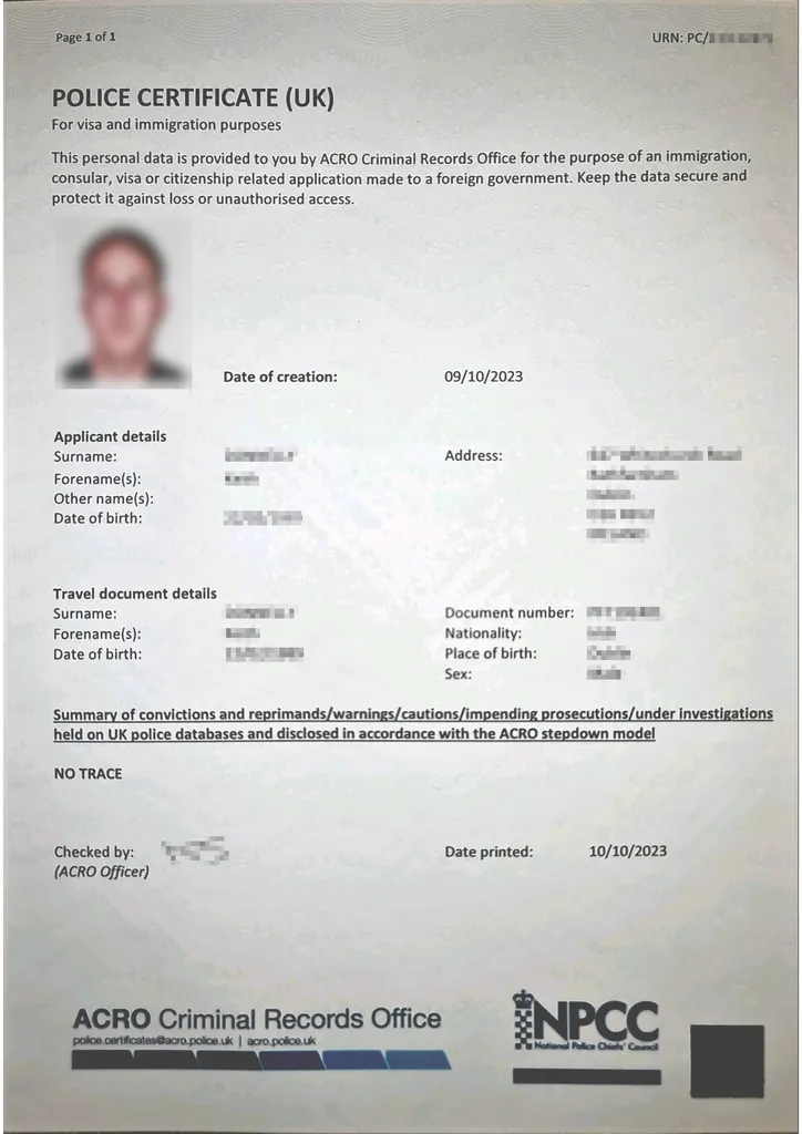 • 文件:ACRO Police Certificate(用于签证/移民),结果常见 “No Trace/No Live Trace”。