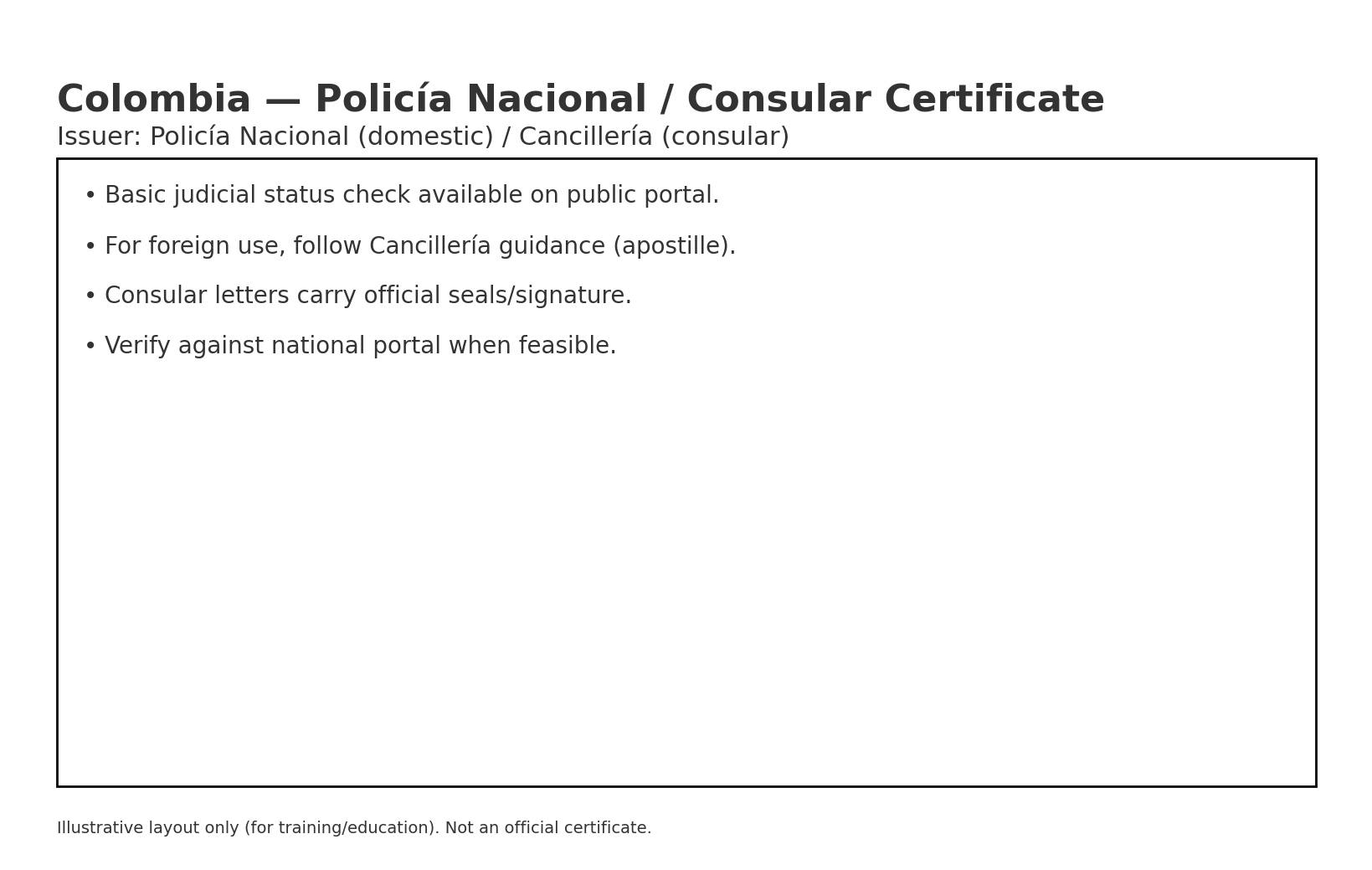 • 验证:警方官网可初步查询有无记录;对外使用建议按外交部(Cancillería)流程做 Apostille/认证。