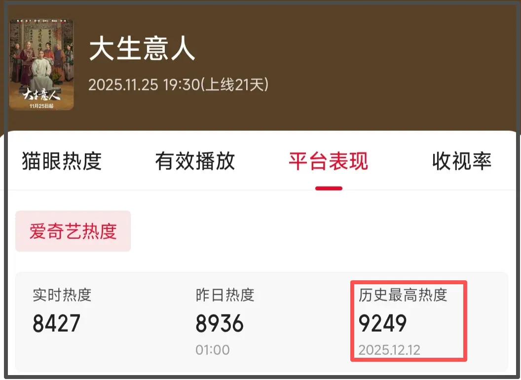 谁也没想到,手握央视底盘的《大生意人》会高开低走。该剧11月25日首播时,收视峰值一度突破3%,创下平台同期纪录,凭借陈晓的国民度与“晚清商战”的题材优势,初期收获不少期待。但随着剧情推进,槽点逐渐密集,口碑直线下滑,最终不仅未能突破万级热度门槛,收官日黄金档热度不升反降,完结后更是断崖式下跌,毫无长尾效应。
