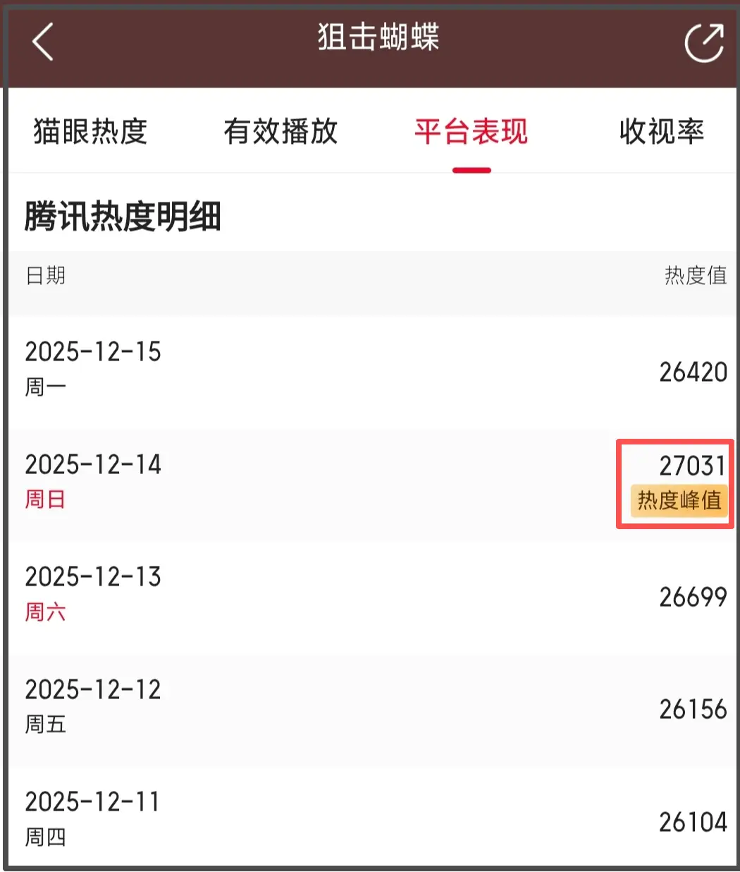 与《大生意人》的黯然收场形成鲜明对比,陈妍希主演的《狙击蝴蝶》自12月4日开播后,热度与口碑一路飙升。这部聚焦离婚女性重建自我的姐弟恋剧,不仅单日播放量峰值达2768万,大结局话题阅读量更是突破10亿,4700万网友在线蹲守结局,剧中“领带吻”“雨巷拥抱”等名场面的二创视频单条播放量破3亿,即便收官热度仍居高不下,多平台重播后长尾效应显著。