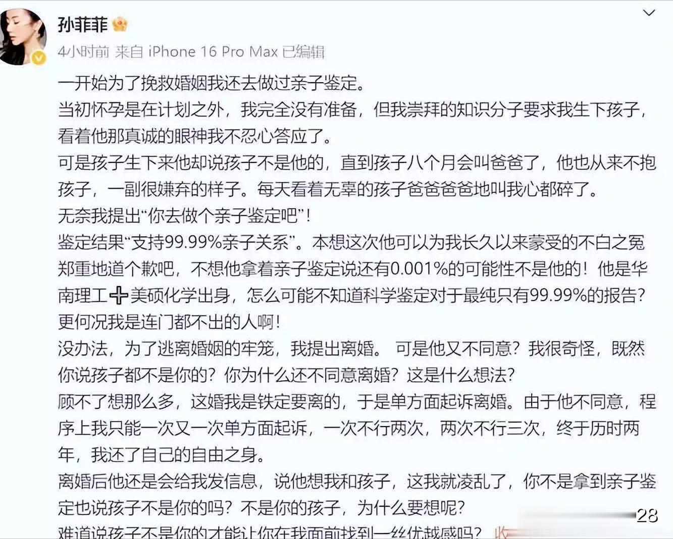 哪怕科学给出了近乎完美的答案,对方却仍紧抓着那0.01%的可能不放。这就像阳光洒满房间,有人却执意只看那道阴影。男方引述各种理论、提出种种假说,却唯独忘了,那个已经会叫“爸爸”的孩子,需要的不过是一个温暖而肯定的拥抱。孙菲菲愿意一次次配合复验,那份诚意,让人心疼——就像努力在碎掉的镜子里找出完整的影子。