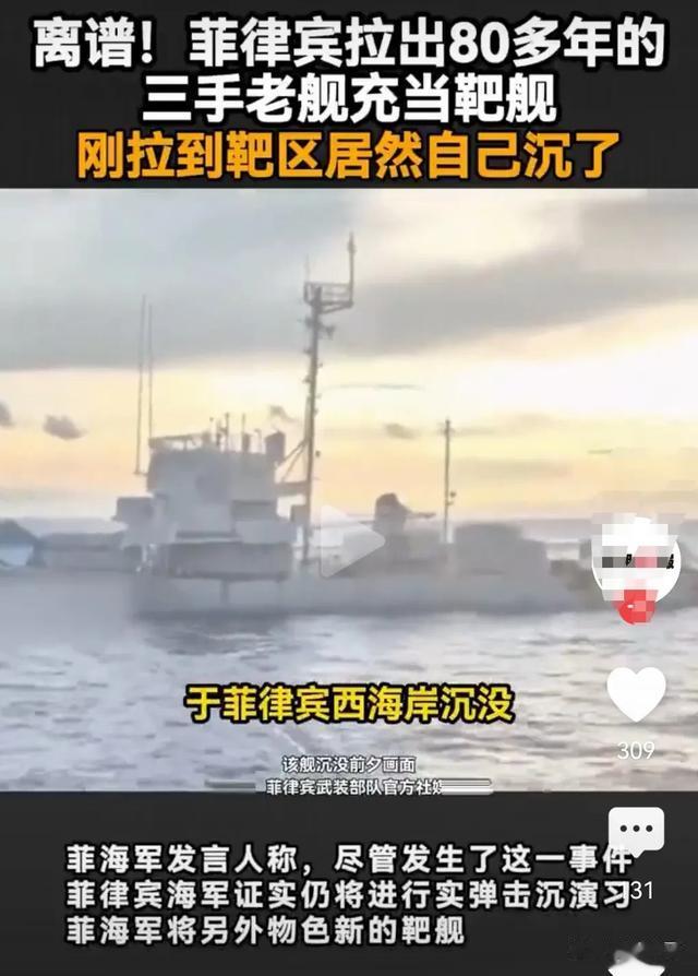 太离谱了,菲律宾拉出80多年的三手老舰充当靶舰,没想到刚拉到靶区居然沉下去了。