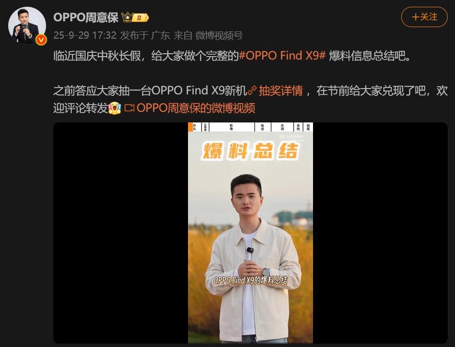 此外,近日OPPO Find 系列产品负责人 @OPPO周意保 还在微博上发汇总视频,总结了OPPO Find X9系列在影像、性能和系统上的全面升级。尤其令人期待的是标准版,被定位为「最强标准版」「旅拍神器」。周意保表示,全系机型均将提供顶级影像体验,Find X9系列将成为移动旅拍的理想选择。