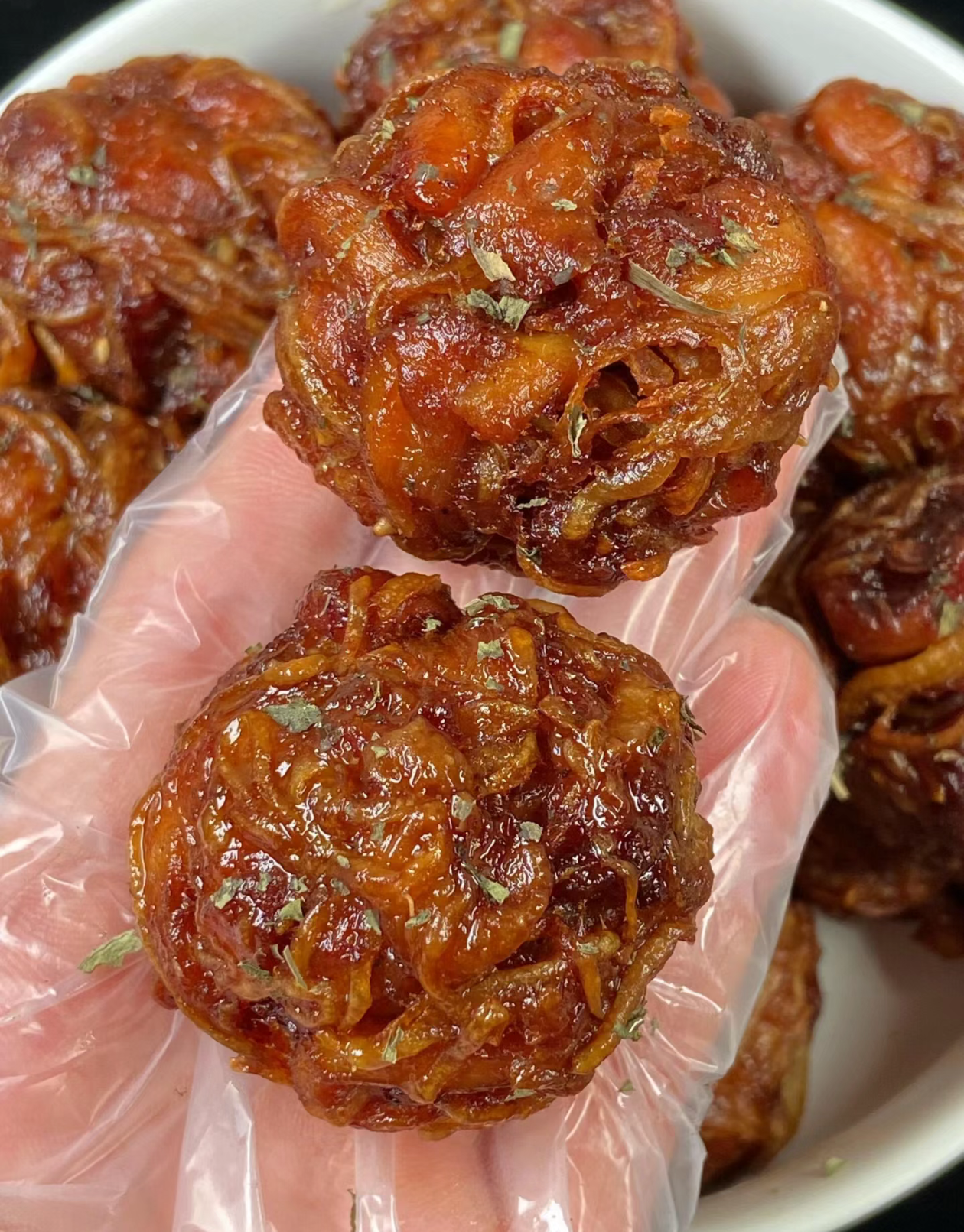 接下来是烹饪的环节。将制作好的肉球放入预热好的油锅中,小火慢慢煎炸。煎炸的过程中,要不断翻动肉球,确保其受热均匀。当肉球表面变得金黄酥脆时,就可以出锅了。