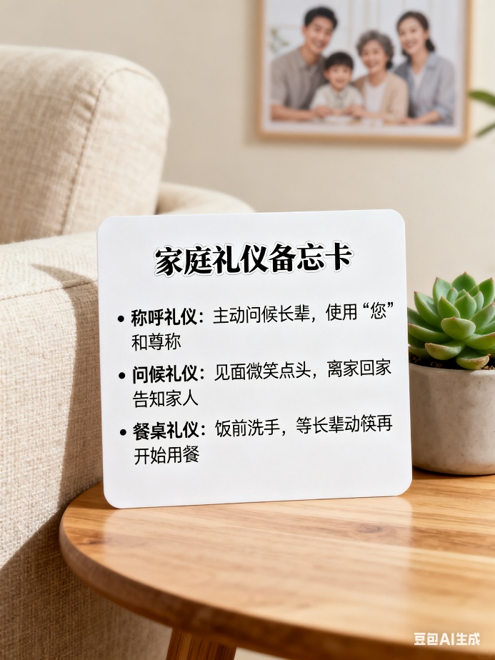 • 准备《家庭礼仪备忘卡》:称呼、问候、餐桌三件套。
