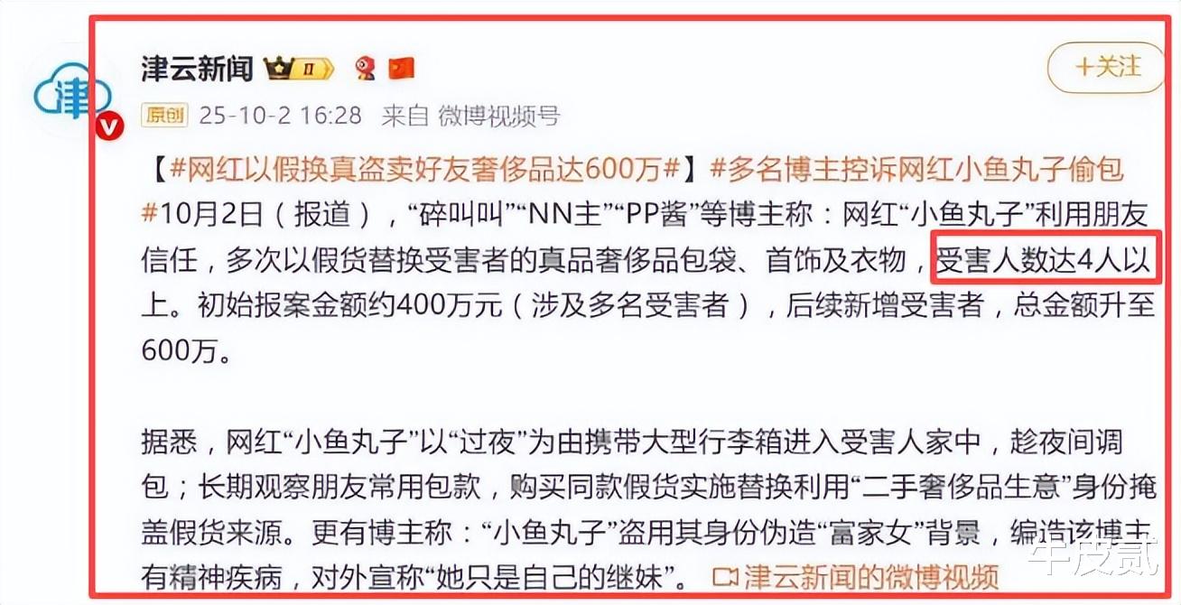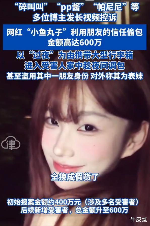 10月2日,多位博主指称名为“小鱼丸子”的女网红盗窃他人财物,总额高达600万元。