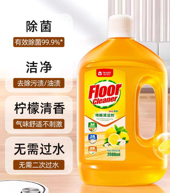 核心优势:国货黑马,高新技术企业出品,浓缩配方,清洁力强劲,能轻松去除家庭地板常见顽固污垢,多效合一,除菌液高达99.9%除菌更彻底;配方温和,瓷砖、大理石、木地板通用。