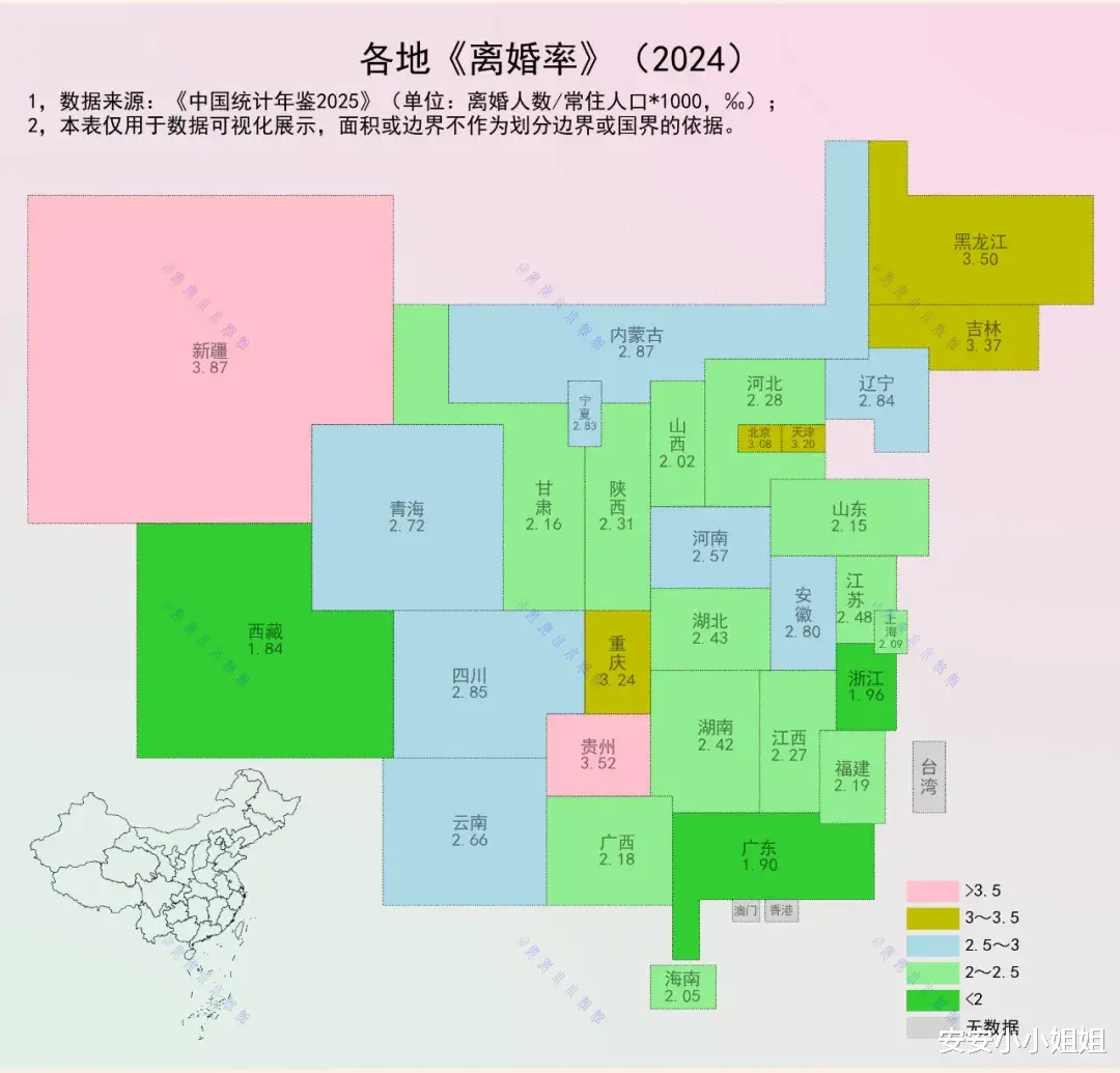 这张色彩分明的矩形地图,以其直观的面积和色块,向我们揭示了婚姻解体现象在中国不同地域的分布密度。