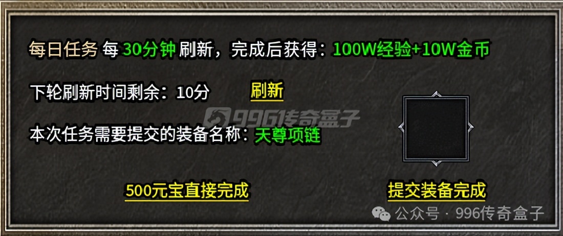 每日任务一定要去完成,给非常多的经验和金币,是前期发育的必需品!将每日任务所需的装备提交即可获得巨额经验和金币,每过30分钟将会刷新一次所需装备,还可以花费500元宝直接完成。