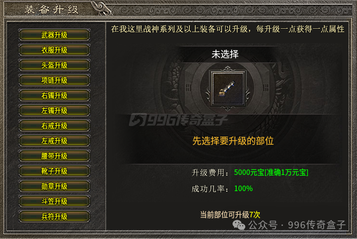 狂风戒指是唯一的攻速装备,只能从宝箱中开出,而宝箱所有BOSS都会爆出,宝箱还能开出法宝。主要货币是金币,只能通过怪物产出,金币用途广泛,前中后期都需要用来强化装备鉴定、狂风、法宝、官品等内容。战神系列及其以上的装备可以提供花费元宝进行强化,根据装备的位置将会提供不同可强化属性,可强化的次数也不同。