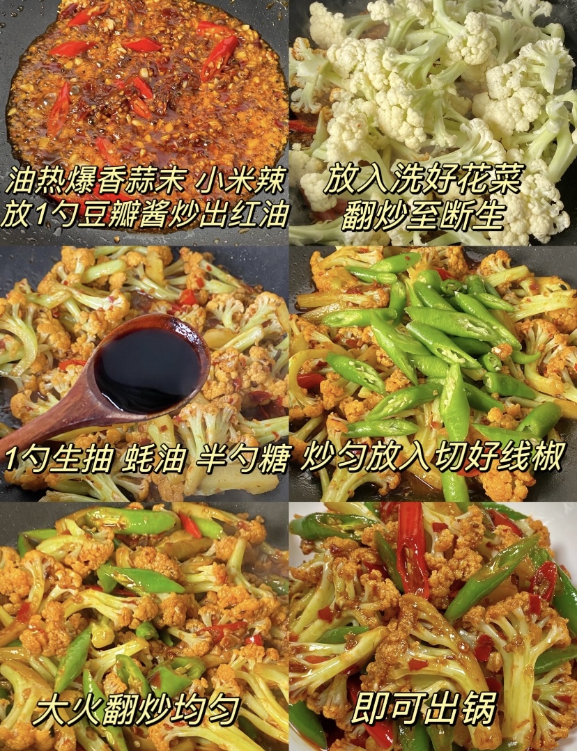 随后,加入一勺生抽、适量的蚝油和半勺糖,翻炒均匀,让花菜充分吸收调味料的味道。生抽和蚝油的搭配能提升菜品的鲜味,而糖则能中和辣味,使整体口感更加平衡。最后,放入切好的线椒段,继续翻炒几下,待线椒断生后,即可出锅装盘。线椒的加入不仅为菜品增添了清新的绿色,还带来了一丝微辣的口感,使整道菜更加丰富多样。
