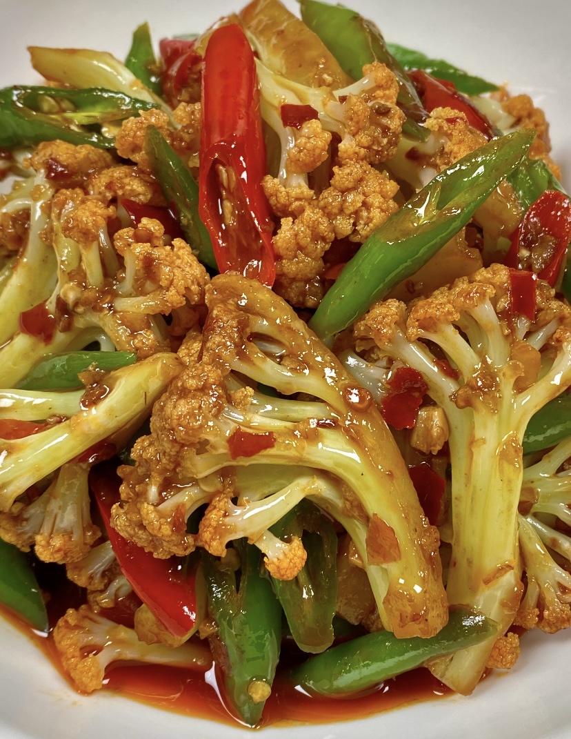 接下来就是烹饪的关键步骤了。首先,在锅中倒入适量的油,油热后放入蒜末和小米辣,用中小火炒出香味。接着,加入一勺豆瓣酱,继续翻炒,直到炒出红油,这一步是干锅花菜风味的关键,豆瓣酱的醇厚和辣椒的香气会充分融合。然后,放入洗好的花菜,转大火快速翻炒,使花菜均匀受热,炒至断生。这一步要注意火候的控制,大火快炒能保持花菜的脆嫩口感,避免炒得过久导致软烂。