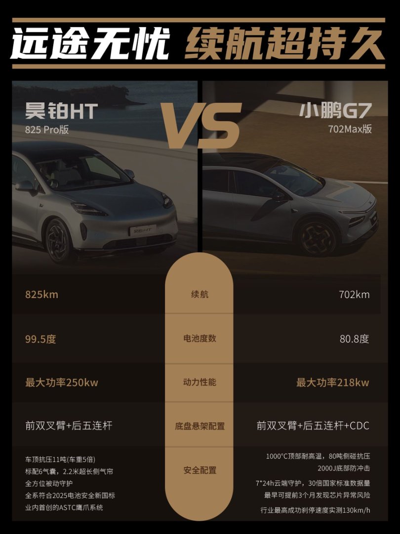 在纯电动车主最关注的续航和补能方面,昊铂HT是20万以内唯一“双800”车型(800V平台+3C电芯),99.5 kWh大电池带来825 km CLTC续航,比小鹏G7的80.8 kWh、702 km多出整整123 km,跨城通勤也能一次搞定。小鹏G7虽标榜5C超充,可日常遇到的第三方桩普遍跑不到那么高功率;昊铂HT则直接送终身免费充电(首任车主),并且全国有超22000根权益充电桩,上班途中或周末购物都能“随停随充”,长期用下来既省心又省钱。