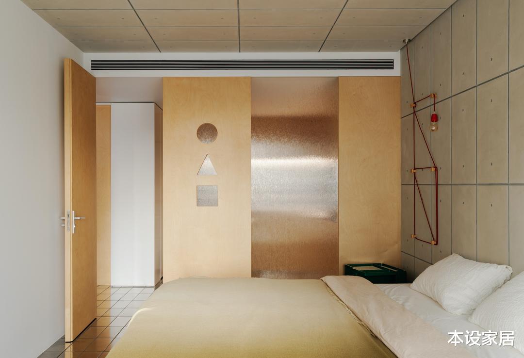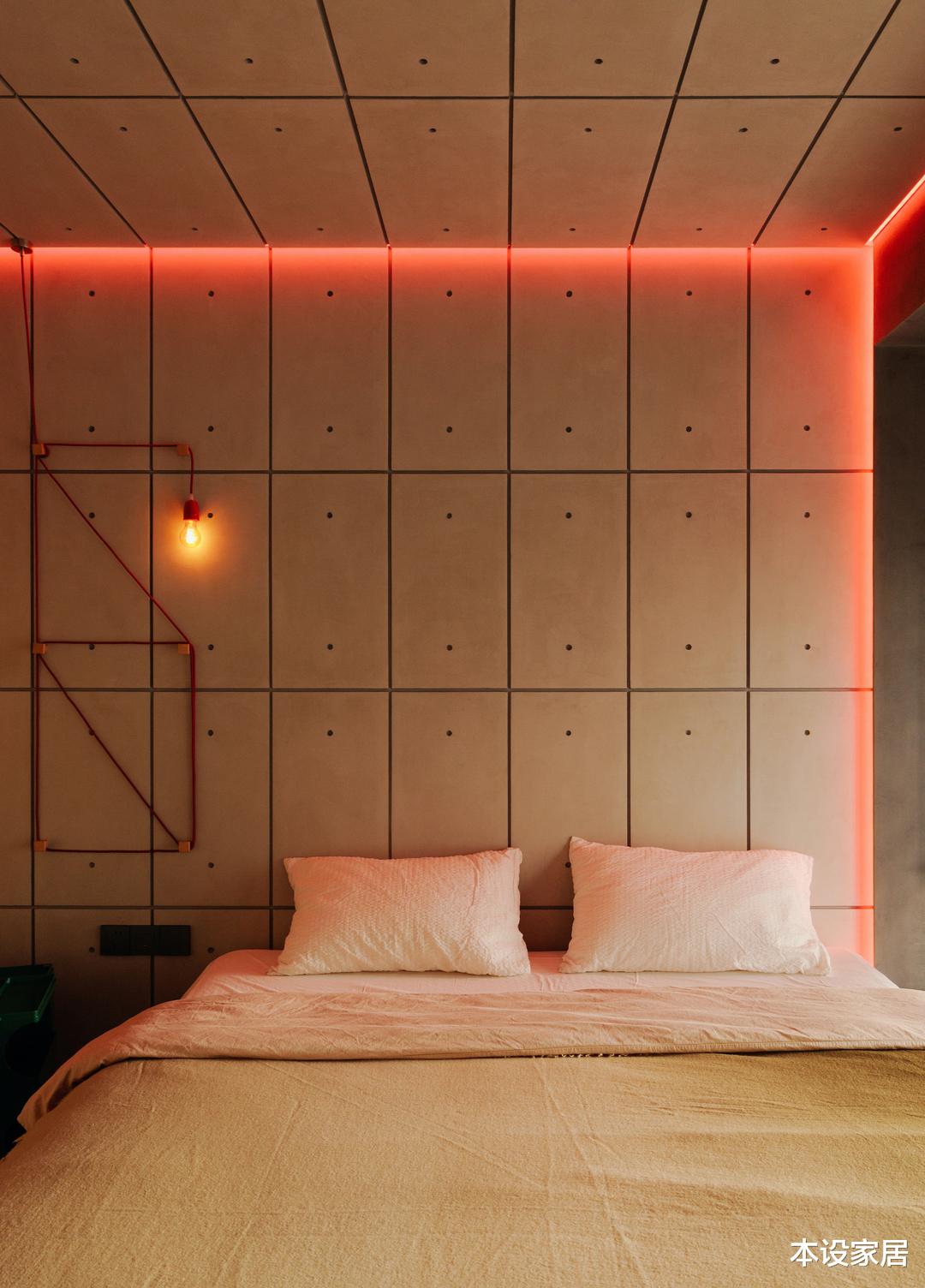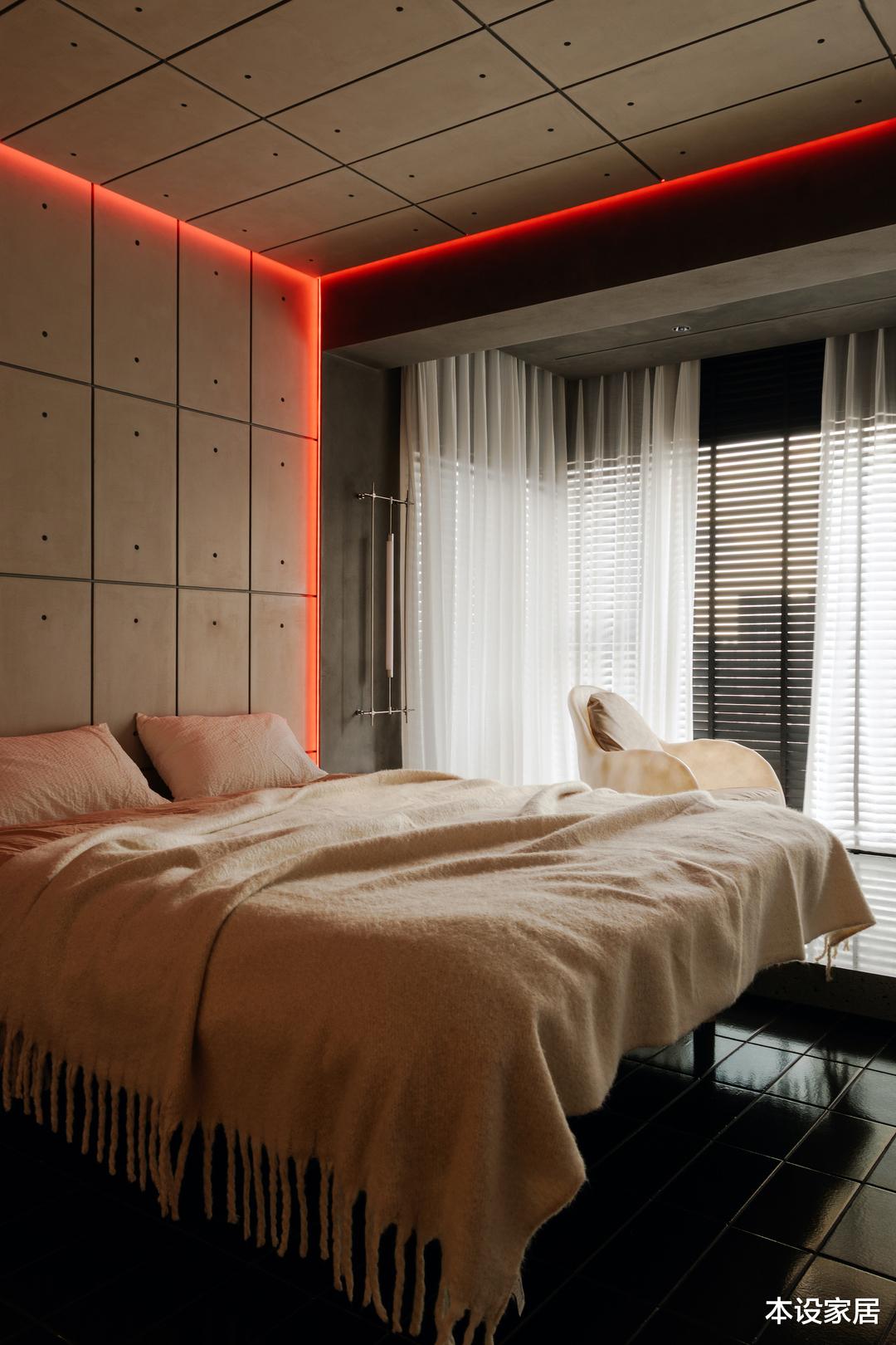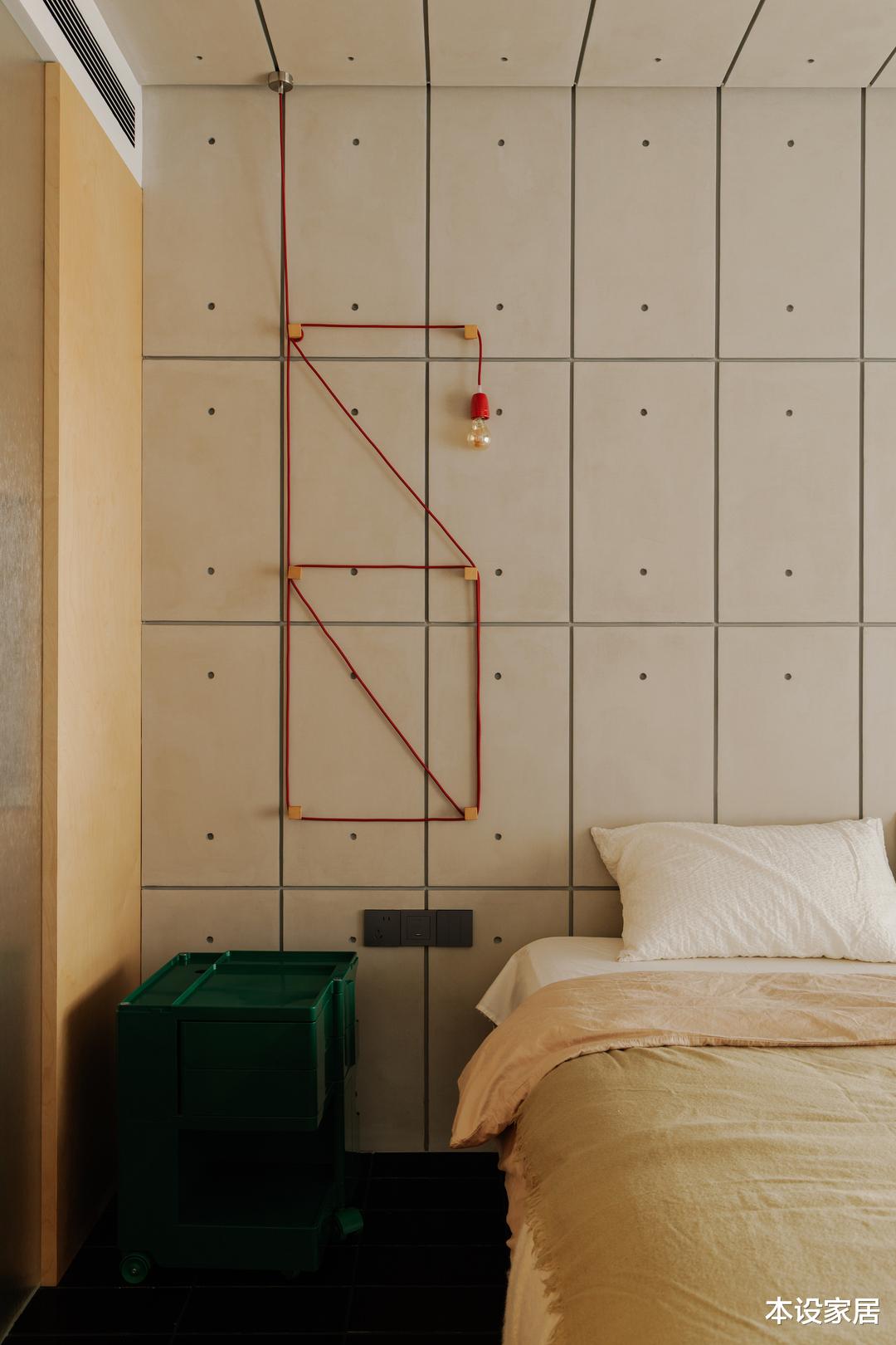 卧室的墙面和天花使用石膏板,先批刮出肌理腻子,再涂刷微水泥艺术漆,打造出清水混凝土的质感,给人一种清冷的宁静感。