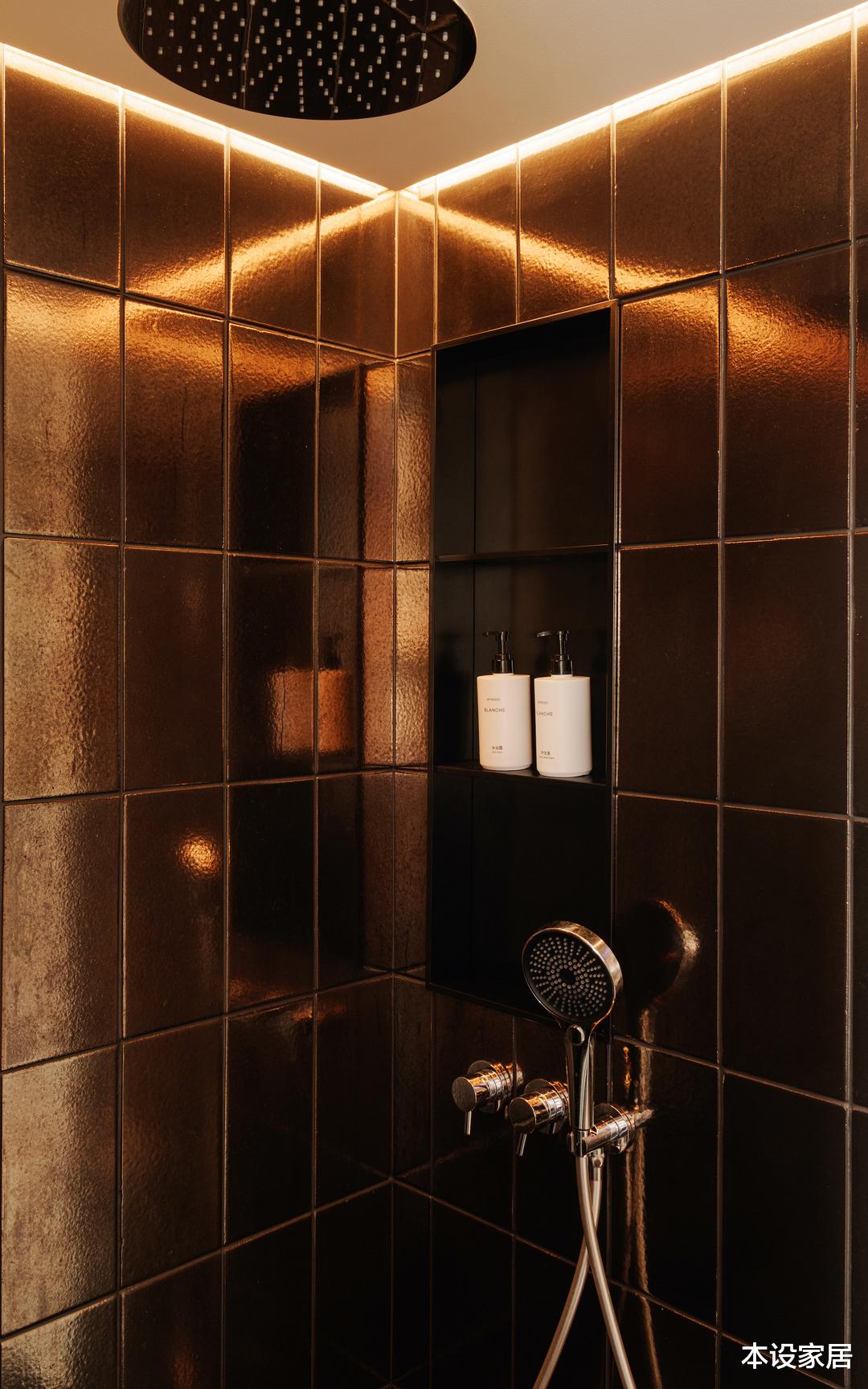 往里左边是淋浴房,中间是马桶间,右侧是洗衣区,特别是是淋浴房,墙面、地面和天花满贴手工黑砖,并配置可切换的灯光和音乐,在这样的氛围里来个畅快淋漓的洗浴,安全感爆棚。