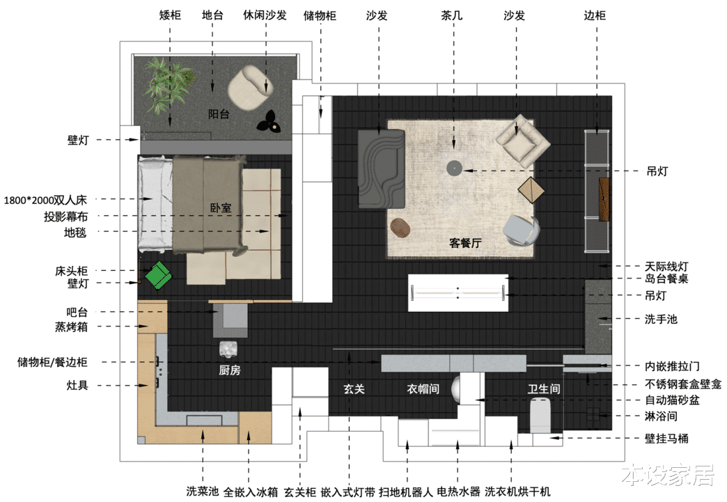 从平面图可以看出,所有功能空间的家具、储物和家电都安排的明明白白。