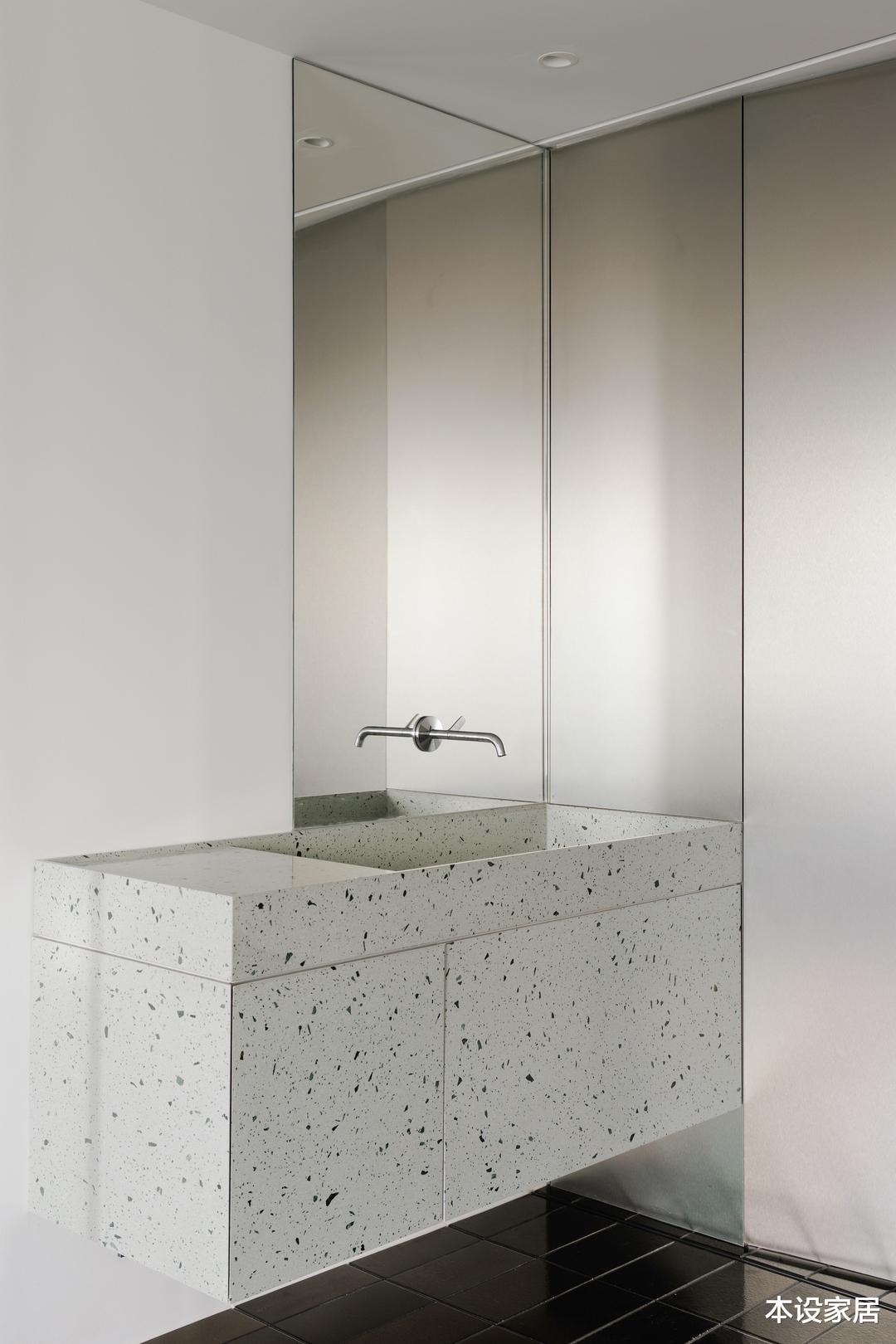 悬空的台盆下部是抽屉柜,可以收纳清洁用品,卫生无死角,而水磨石和不锈钢的无缝结合,越极简越高级。